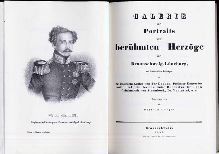 Görges, Wilhelm (Hrsg.): Galerie von Portraits der berühmten Herzöge von Braunschweig-Lüneburg. Mit biographischem Texte. Reprint der Ausgabe 1840. Braunschweig, Archiv Verlag, [2002]. Ca. 30 x 21,5 cm. (4 S.), IV S., (2) S., 138 S., (2) Seiten. Mit zahlreichen ganzseitigen Illustrationen und zwei mehrfach gefalteten Stammtafeln. Original-Ganzledereinband. Blindprägestempel auf Tite. „Zu jedem Artikel finden Sie ein charakteristisches Porträt des betreffenden Herzogs. Dem Band als Beilage habe ich außerdem noch die eindrucksvolle Stammtafel des Hauses Braunschweig des bekannten Landeshistorikers Paul Zimmermann hinzugefügt.“ (Begleitschreiben des Verlegers). Gutes Exemplar.