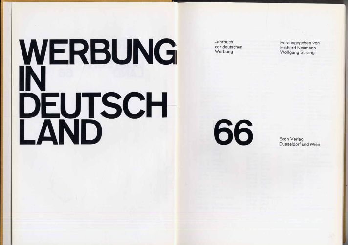 Neumann, Eckhard und Wolfgang Sprang (Hrsg.): Werbung in Deutschland ’66. Jahrbuch der deutschen Werbung. Düsseldorf und Wien, Econ Verlag, 1966. Ca. 30 x 21,5 cm. 384 Seiten. Mit zahlreichen, teils farbigen Abbildungen. Orig.-Leinenband. Vorsatz mit Stempel einer Firmenbibliothek. Überaus reich illustriert.
