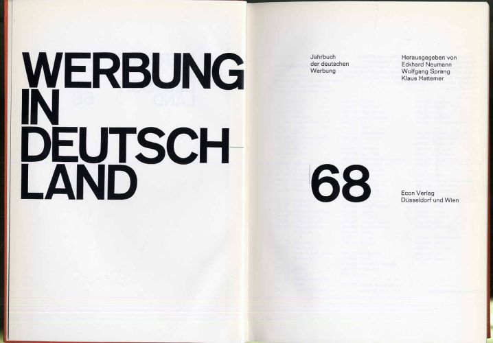 Neumann, Eckhard, Wolfgang Sprang und Klaus Hattemer (Hrsg.): Werbung in Deutschland ’68. Jahrbuch der deutschen Werbung. Düsseldorf und Wien, Econ Verlag, 1968. Ca. 30 x 21,5 cm. 340 Seiten. Mit zahlreichen, teils farbigen Abbildungen. Orig.-Leinenband. Rücken kleiner Einriss, sonst gutes Exemplar. Überaus reich illustriert.