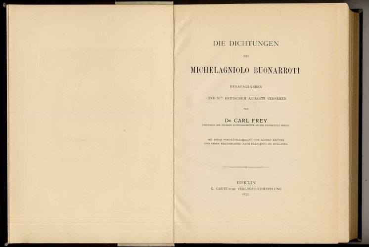 Michelangelo – Frey, Carl (Hrsg.): Die Dichtungen des Michelagniolo Buonarroti. Herausgegeben und mit kritischen Apparate versehen. Berlin, G. Grote’sche Verlagsbuchhandlung, 1897. XXVI S., (2) S., 546 S., (2) Seiten. Mit einer Porträtradierung von Albert Krüger und einer Heliographie nach Francesco da Hollanda und einer Textillustration. Halbpergamentband der Zeit mit goldgeprägtem Rückentitel, mit Kopfgoldschnitt. Am Schluss ist der Originalbroschureinband mit eingebunden. Dichtungen in italienisch; Vorrede und umfangreicher Handapparat (ab Seite 279) in deutsch. Sehr gutes Exemplar.