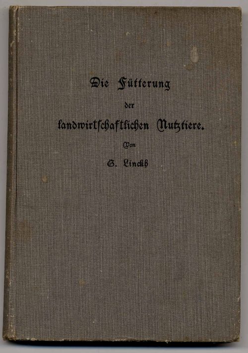 Linckh, G.: Die Fütterung der landwirtschfaftlichen Nutztiere. Auf Grund der neuesten Forschungsergebnisse und praktischer Erfahrung in gemeinverständlicher Form. Stuttgart, Verlagsbuchhandlung Eugen Ulmer, 1907. Ca. 23 x 16 cm. (2) S., XIII S., 301 S., (5) Seiten. Grauer Orig.-Leinenband. Aus dem Inhalt u.a.: Wie erfährt man, welche Menge der in einem Futtermittel enthaltenen Nährstoffe verdaulich ist?; Grünfutter; Dürrheu; Brennheu, Braunheu, Sauerfutter; Süßpreßfutter; Stroh; Spreu und Schoten; Wurzeln und Knollen; Körner und Früchte; Mahlabfälle; Abfälle der Stärkefabrikation; … Gärungsgewerbe; …Zuckergewerbe; Rückstände der Ölfabrikation; Futtermittel tierischen Ursprungs. Fütterung der einzelnen Tiere (Arbeitsochsen, Arbeitspferde, Rindvieh, Schafe, Schweine, Kälber etc.). Einband berieben und Hinterdeckel stärker beschabt. Namenszug auf Vorsatz.