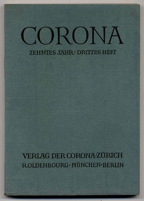 Bodmer, Martin (Hrsg.): Corona. Zehntes Jahr, drittes Heft. München – Berlin, R. Oldenbourg, 1941. Ca. 21 x 15 cm. Grüner originalkartonierter Einband. Corona, literarischen Zweimonatsschrift, die in den Jahren 1930 bis 1943 in München und Zürich erschien. Mit Beiträgen u.a. von Werner Jaeger, Hölderlin, Hugo von Hofmannsthal, Rudolf Kassner, Josef Hofmiller.