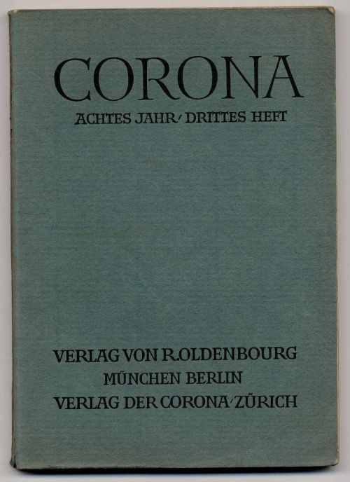 Bodmer, Martin (Hrsg.): Corona. Achtes Jahr, drittes Heft. München – Berlin, R. Oldenbourg, 1938. Ca. 21 x 15 cm. Grüner originalkartonierter Einband. Rücken leicht bestoßen. Corona, literarischen Zweimonatsschrift, die in den Jahren 1930 bis 1943 in München und Zürich erschien. Mit Beiträgen u.a. von Hermann Hesse, St.-J. Perse, Hugo von Hofmannsthal, Rudolf Kassner.