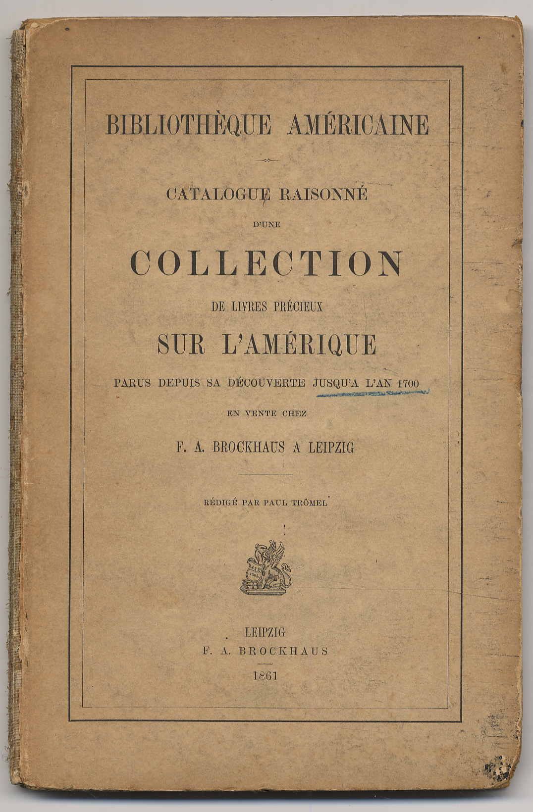Tromel, Paul: Bibliothèque Américaine. Catalogue raisonné d’une collection de livres précieux sur l’Amerique parus depuis sa découverte jusqu’a l’an 1700 ex vente chez F.A. Brockhaus a Leipzig. Leipzig, F.A. Brockhaus, 1861. Ca. 21 x 14 cm. XI S., 131 Seiten. Orig.-Pappband. Verzeichnet 435 Titel. Rücken fehlt. Kanten bestoßen. Vorsätze stark gebräunt und mit Stempel. In französischer Sprache.