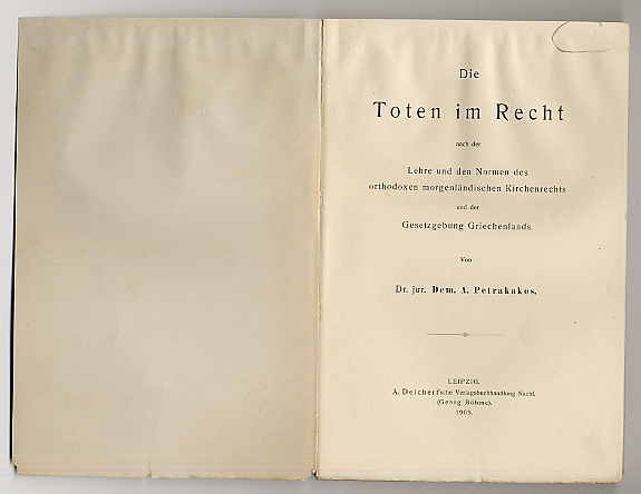 Petrakakos, Dem[etrius] A.: Die Toten im Recht. Nach der Lehre und den Normen des orthodoxen morgenländischen Kirchenrechts und der Gesetzgebung Griechenlands. Leipzig, A. Deichert’sche Verlagsbuchhandlung, 1905. Ca. 23 x 15 cm. XIX S., 248 S., (4) Seiten. Orig.-Broschur. Einband fleckig und Rücken bestoßen.Seiten am oberen Rand leicht gewellt. Unbeschnittenes Exemplar.