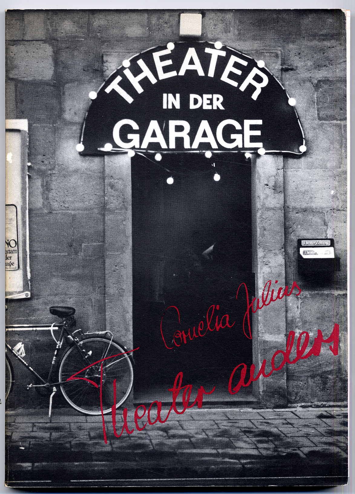 Julius, Cornelia: Theater anders. Nürnberg, Verlag Medien & Kultur, 1979. Ca. 29,5 x 21 cm. 300 Seiten. Mit zahlreichen Abbildungen. Farbig illustrierter Orig.-Karton. „Das Buch gibt ein lebendiges Bild der Szene um die „GARAGE“ wieder – einer Theaterkneipe, die sich 1975 in der Altstadt Erlangens in einer ehemaligen Feuerwehrgarage etablierte. Aus Texten, Fotos, Bildern und Zitaten entsteht eine Collage der Theaterkneipe und ihrer Gäste aus allen Teilen Europas und Ameriks …“. Gutes Exemplar.