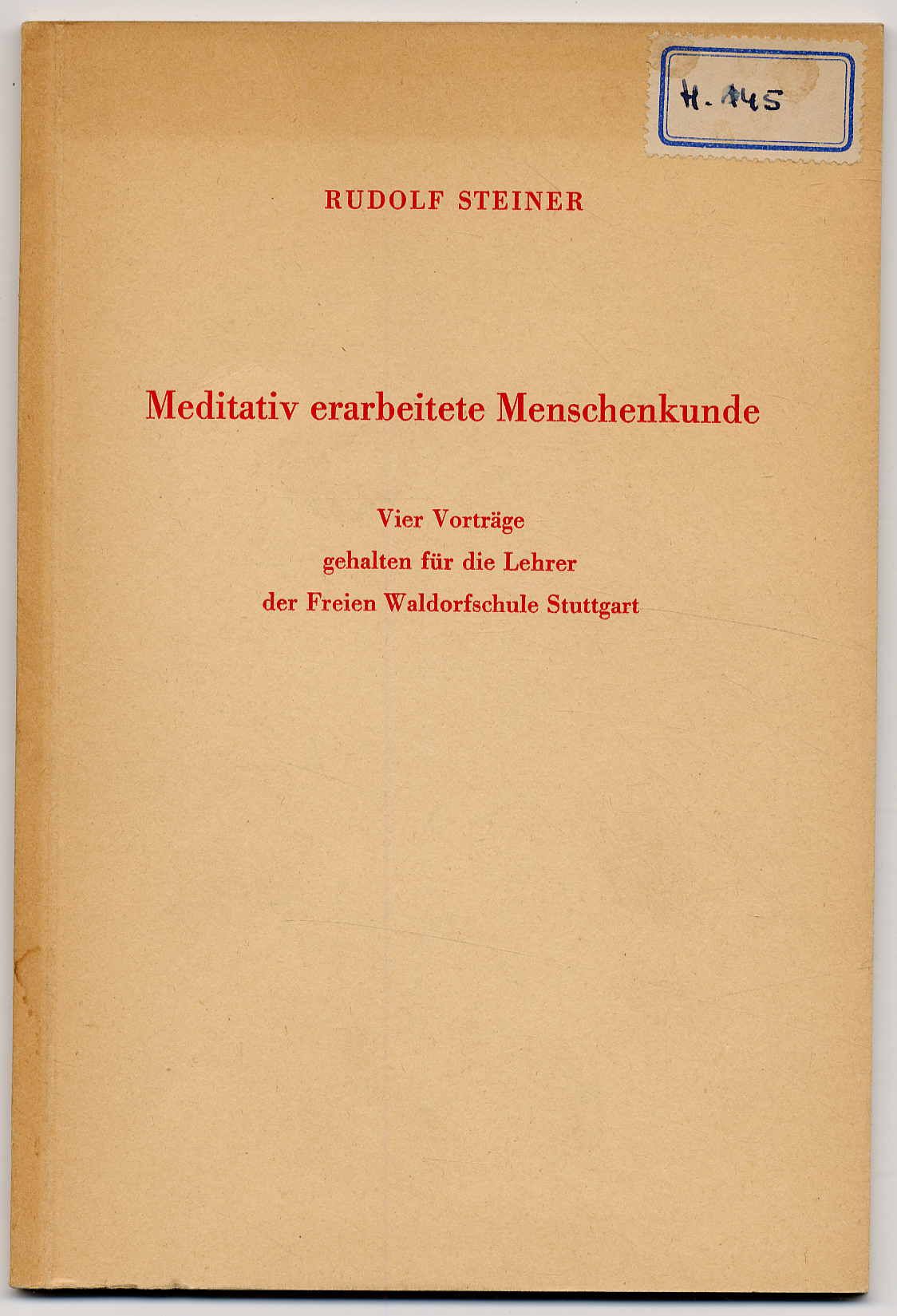 Steiner, Rudolf: Meditativ erarbeitete Menschenkunde. Vier Vorträge gehalten für die Lehrer der Freien Waldorfschule Stuttgart vom 15. bis 22. September 1920. Basel, R. G. Zbinden & Co., 1952. Ca. 22,5 x 15,5 cm. 60 Seiten. Originalkartonierter Einband. Handschriftlicher Nummernaufkleber auf Einbanddeckel. Einband minimal lichtrandig, sonst gutes Exemplar.