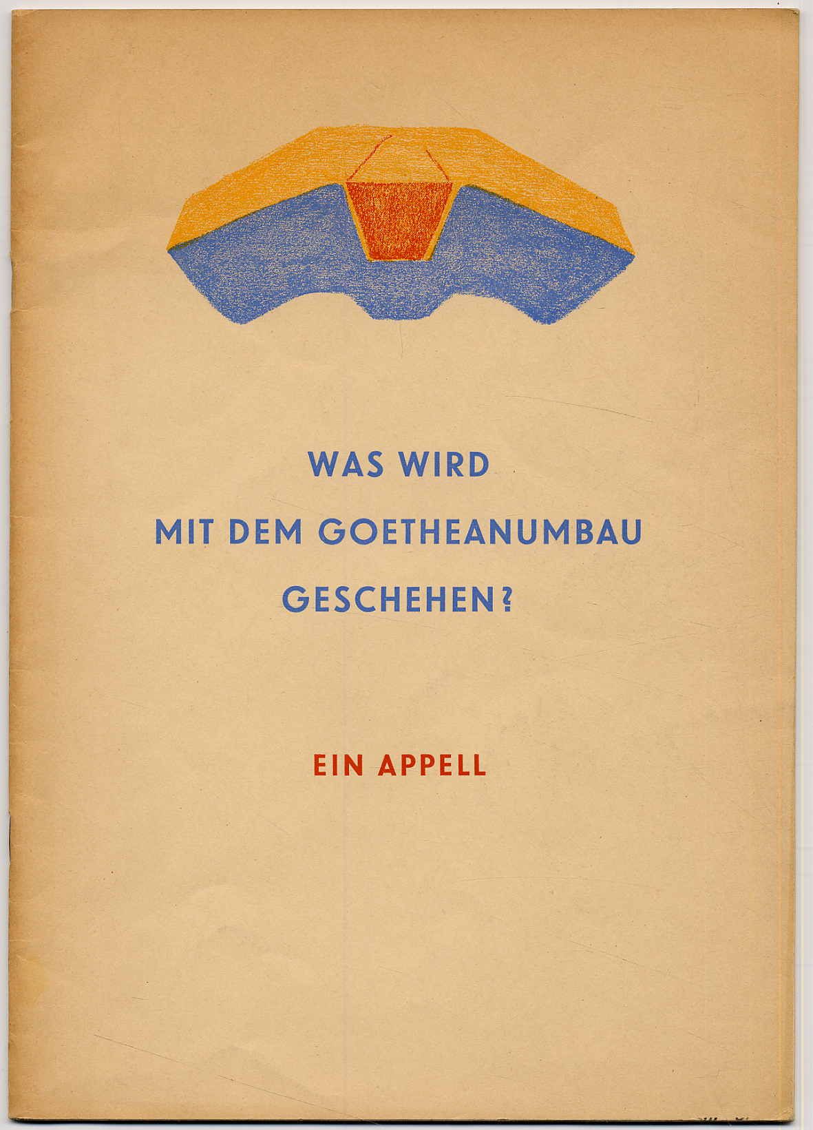 Turgenieff, Assia: Was wird mit dem Goetheanumbau geschehen? Ein Appell. Mit einem Vor- und Nachwort von Paul Jenny. Basel, R. G. Zbinden & Co., 1956. Ca. 29,5 x 21 cm. 32 Seiten. Mit Illustrationen. Mit einem als Anhang bezeichneten Beiblatt: Rudolf Steiner: „Der Wiederaufbau des Goetheanums*“ Farbig illustr. Orig.-Broschur. Hinterdeckel mit kleiner Kugelschreiberspur, sonst sehr gutes Exemplar. „So wird wieder, wie beim alten Goetheanum, das, was Anthroposophie zu sagen hat, auch in den Bauformen und in dem ganzen Baugedanken empfunden werden können, in denen sie das Haus errichtet, in dem sie wirken soll.“ (Steiner).