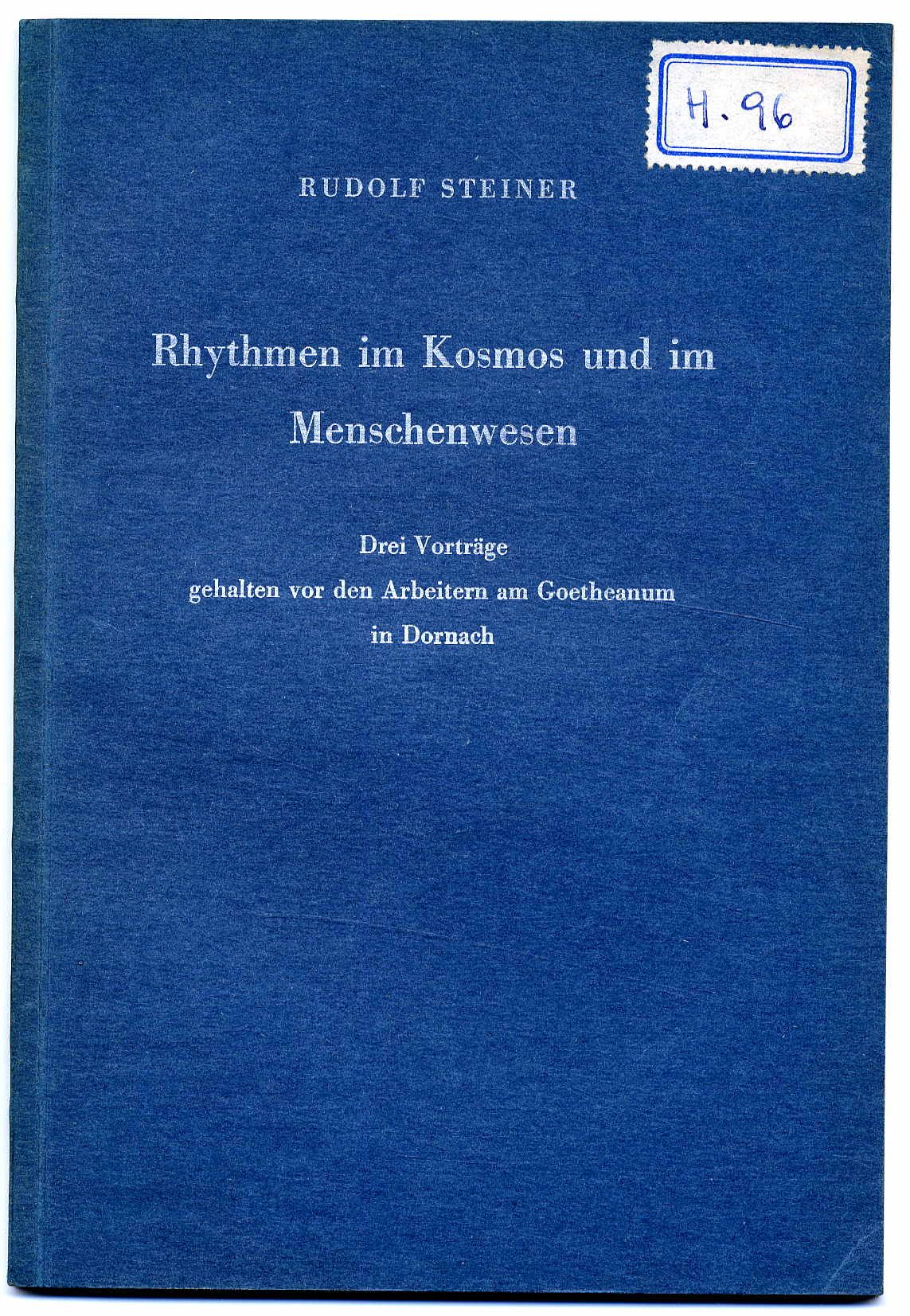Steiner, Rudolf: Rhythmen im Kosmos und im Menschenwesen. Drei Vorträge gehalten vor den Arbeitern am Goetheanum in Dornach 20. bis 28. Juli 1923. Als mündliche, nicht zum Druck bestimmte Mitteilungen waren die Inhalte dieser Vorträge gedacht. Nach einer vom Vortragenden nicht durchgesehenen Nachschrift hrssg. von Marie Steiner und Johannes Waeger. Dornach, Philosophisch-Anthroposophischer Verlag Goetheanum, 1949. Ca. 22,5 x 15,5 cm. VIII S., 49 S., (3) Seiten. Blauer Originalkartonierter Einband. Handschriftlicher Nummernaufkleber auf Einbanddeckel, Nummer auf Vorsatz. Gutes Exemplar. Enthält: Rhythmen im Kosmos und im Menschenwesen; Die Entstehung des Gewissens im Laufe der Menschheitsentwicklung; Entwicklungswahrheiten der neueren Zeit; Yogawissen.