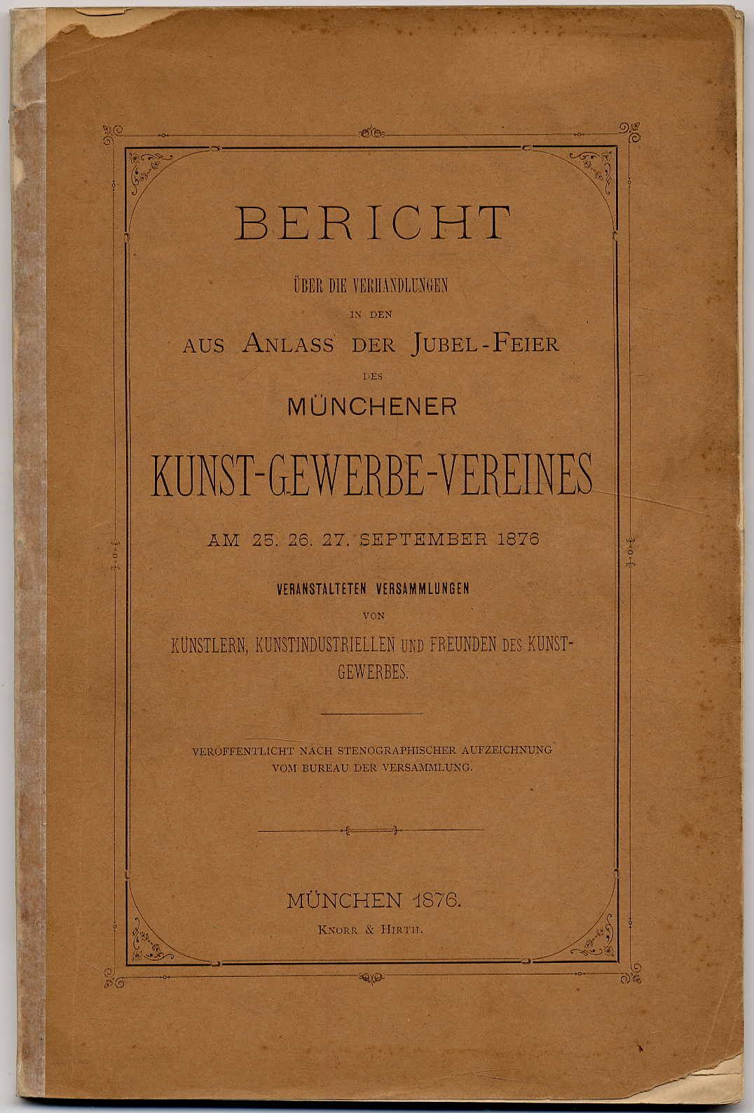 München – Bericht über die Verhandlungen in den aus Anlass der Jubelfeier des Münchener Kunstgewerbevereines am 25. 26. 27. September 1876 veranstalteten Versammlungen von Künstlern, Kunstindustriellen und Freunden des Kunstgewerbes. München, Knorr & Hirth, 1876. Ca. 23,5 x 16 cm. 104 Seiten. Orig.-Broschur. Broschur mit Randfehlstellen, etwas stockfleckig, Rücken verstärkt. Mit Exlibris. Besitzstempel auf Titelblatt. Einige wenige Rotstiftunterstreichungen. Veröffentlicht nach stenographischen Aufzeichnungen vom Bureau der Versammlung. Mit Verzeichnis der Teilnehmer.