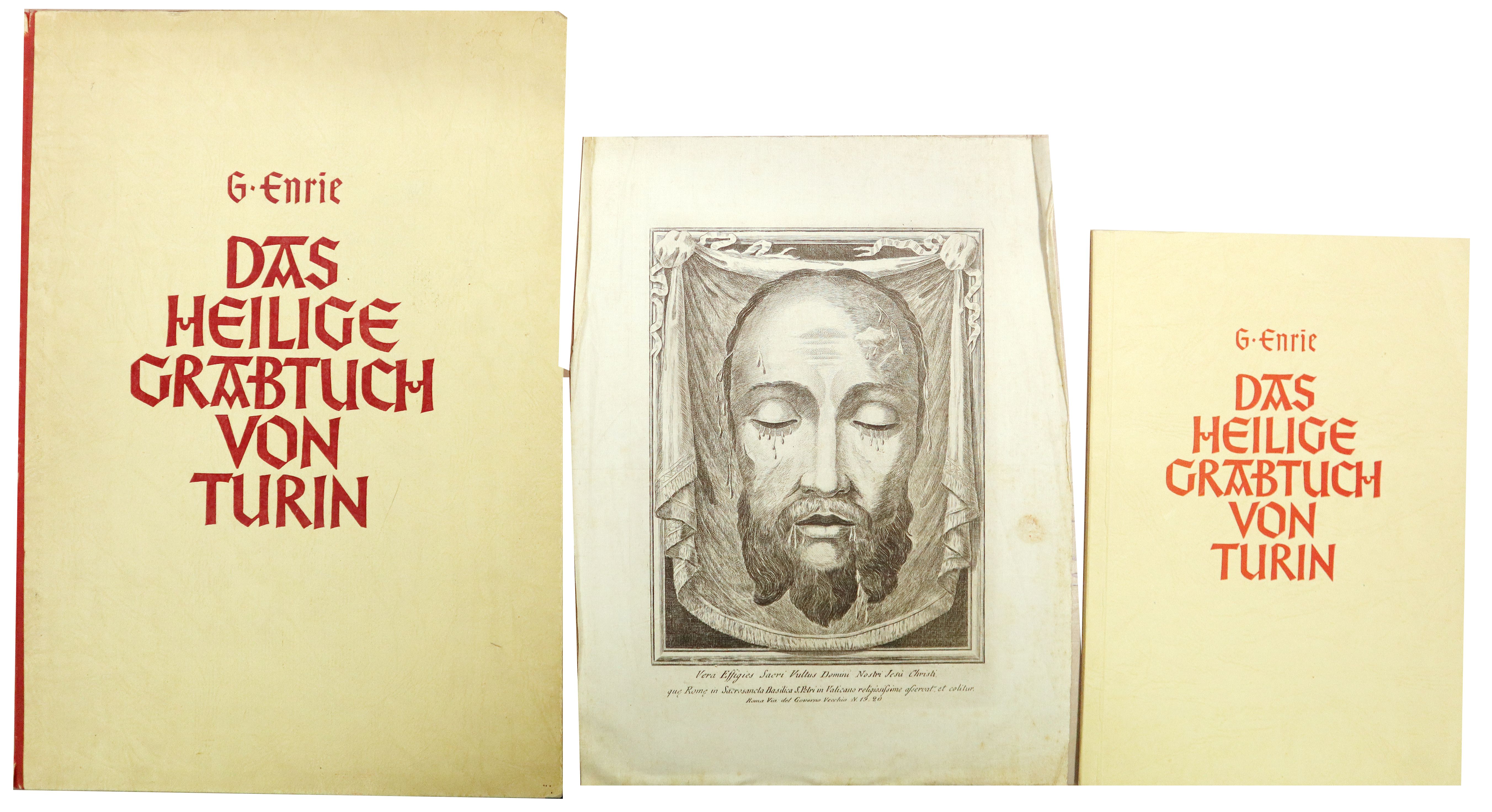 Enrie, Giuseppe: Das heilige Grabtuch von Turin. Mit einer Mappe der letzten amtlichen Lichtbilder in Kupfertiefdruck wiedergegeben. Karlsruhe, Badenia Verlag, 1939. Ca. 25 x 17,5 cm (Textheft), ca. 35 x 25 cm (Mappe). 98 Seiten (Textheft), 42 Abbildungen auf 22 Tafeln. Originalkartonierter Einband bzw. Original-Halbleinenmappe. Mappenflügel mit Randeinrissen. Rücken mit handschriftlichem Titel, bestoßen, Leinen teils aufgeplatzt. Beiliegend: Radierung auf Leinen „Vera effigies sacri vultus domini nostri Jesu Christi que Rome in Sacrosancta Basilica S. Petri in Vaticano“. Tuchgröße ca. 29,5 x 22 cm.
