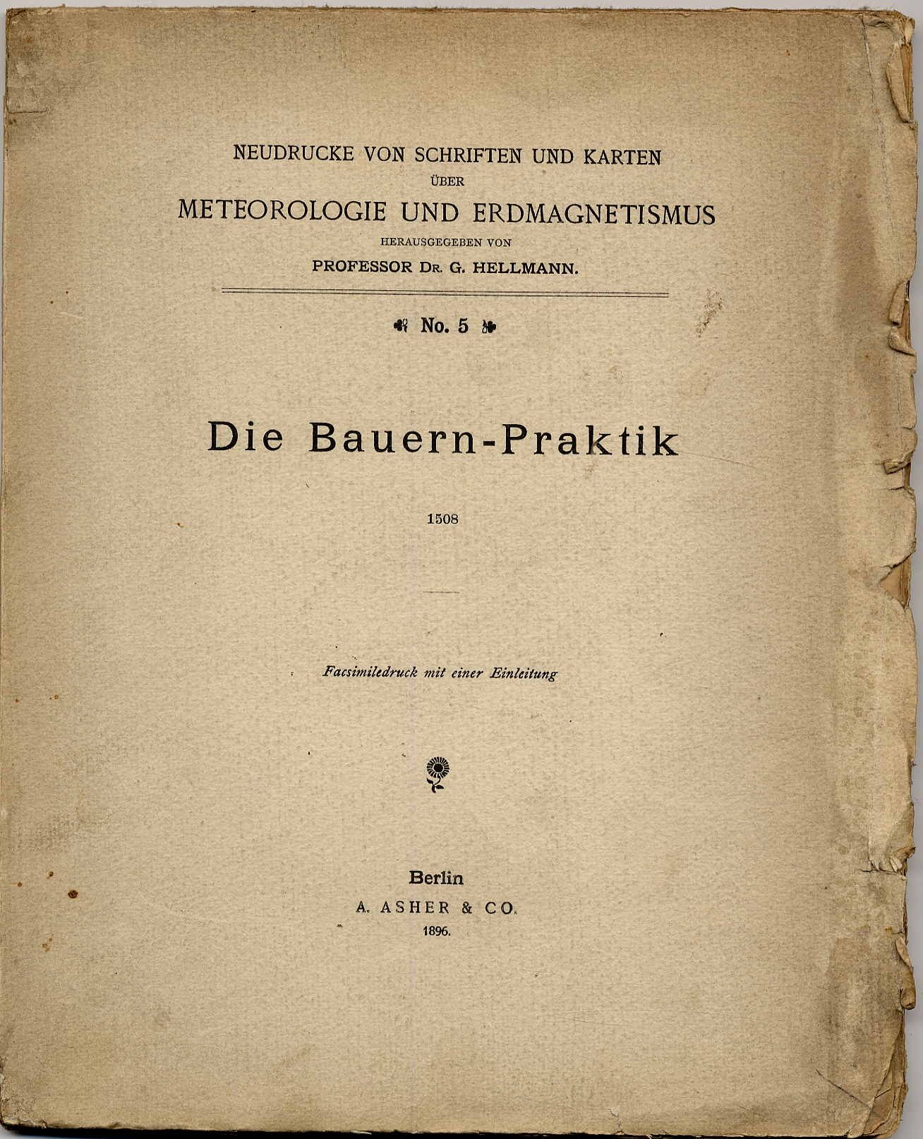 Witterungsvorhersage – Die Bauern-Praktik 1508. Facsimiledruck mit einer Einleitung. Berlin, A. Asher & Co., 1896. Ca. 25,5 x 20,5 cm. 72 S., (12) Seiten. Orig.-Broschur. Aus der Reihe: Neudrucke von Schriften und Karten über Meteorologie und Erdmagnetismus, hrsgg. von G. Hellmann. Einband stärker angestaubt. Vorderdeckel stärker angerändert und mit Randeinrissen. Seiten teils etwas angerändert, breitrandiges, unbeschnittenes Exemplar. Mit handschriftlicher Widmung „vom Herausgeber“, datiert 1910. „Die Bauern-Praktik ist das verbreiteste aller meteorologischen Bücher. Sie erschien zuerst 1508 im Druck … Der Hauptinhalt … in ihrer ursprünglichen Gestalt besteht in der Voraussage der Witterung des ganzen Jahres aus dem Verhalten des Christtages und der zwölf Tage von Weihnachten bis Epiphanias.“