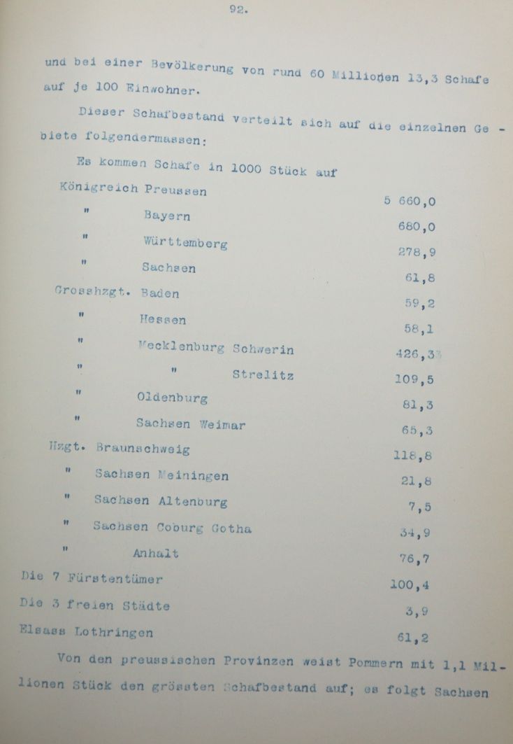 Mönckmeier, Wilh.: Die Entwicklung der deutschen Schafzucht. Um 1906. Ca. 26,5 x 21 cm. 165 einseitig beschriebene Blätter (Typoskript-Durchschläge). Halbleinenband der Zeit. Auf dem Deckel die Verfasserangabe „Wilh. Mönckmeier“. Mit einigen handschriftlichen Berichtigungen.