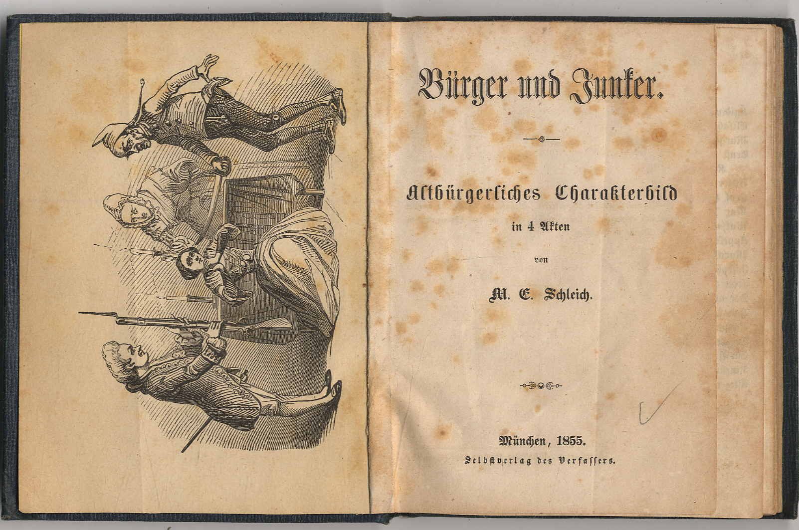 Schleich, M[artin] E.: Bürger und Junker. Altbürgerliches Charakterbild in 4 Akten. München, Selbstverlag des Verfassers, 1855. Ca. 13 x 10,5 cm. 126 Seiten. Mit 2 Holzschnitttafeln. Grüner Leinenband der Zeit mit Blindprägung und Rückengoldprägung. Die ersten drei Blätter am Falz mit Papier verstärkt. Seiten stockfleckig, anfangs stärker.