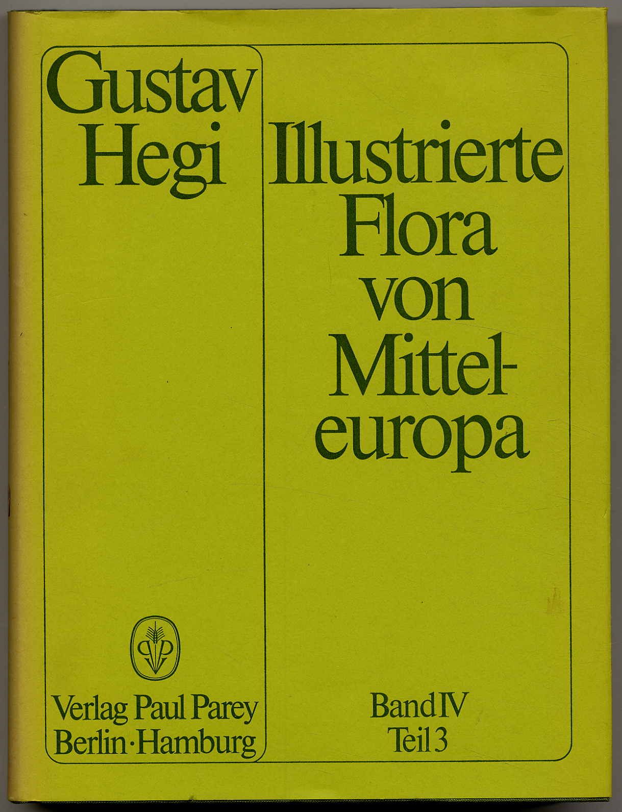 Hegi, Gustav: Illlustrierte Flora von MItteleuorpa. Band IV Teil 3. Dicotyledones, 2. Teil: Leguminosae – Tropaelaceae. Berlin und Hamburg, Paul Parey, 1975. Ca. 27 x 20 cm. (9) S., Zählung beginnt mit Seite 1.114 – Seite 1750, (2) Seiten. Mit 17 farbigen Tafeln und 383 Textabbildungen und Karten. Grüner Orig.-Leinenband mit Goldprägung, mit Schutzumschlag. Schutzumschlagrücken mit zwei Aufklebern, sonst sehr gutes Exemplar. Die Neuauflage des erstmals 1906 erschienen Grundlagenwerkes enthält neue Fundorte, neue Arten und Varietäten sowie neue Forschungsergebnisse und Bildmaterial nach dem neuesten Stand der Forschung.