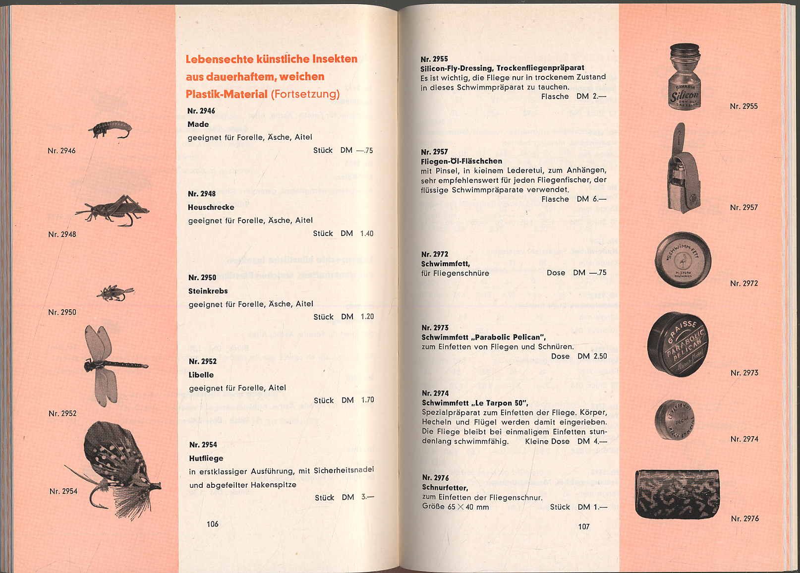 Stork – Angelgeräte-Katalog 60. H. Stork, München. München, 1960. Ca. 22 x 15,5 cm. 159 Seiten. Mit zahlreichen s/w-Abbildungen und 4 farbigen Tafeln mit Kunstfliegen. Farbig illustrierter Orig.-Karton. Verkaufskatalog mit Preisen. Gutes Exemplar. Wichtiges Nachschlagewerk für alle Sammler von alten Angelgeräten.