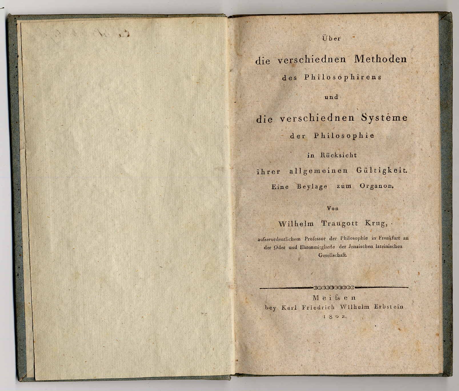 Krug, Wilhelm Traugott: Über die verschiedenen Methoden des Philosophierens und die verschiedenen Systeme der Philosophie in Rücksicht ihrer allgemeinen Gültigkeit. Eine Beylage zum Organon. Meißen, Karl Friedrich Wilhelm Erbstein, 1802. Ca. 20 x 12 cm. XIII S., 53 Seiten. Pappband der Zeit. 1. Auflage. Kleiner Namenszug auf Vorsatz. Seiten teils leicht stockfleckig, jedoch gutes Exemplar. Krug, (1770-1842, Philosoph), erhielt 1805 als erster Nachfolger Kants in Königsberg eine o. Professur für Philosophie. 1809 ging er nach Leipzig, wo er bis zu seinem Tode lehrte. „Die Bedeutung K.s liegt weniger in seiner Philosophie als vielmehr darin, daß er es dank einer verständlichen Sprache verstand, in der breiten Öffentlichkeit das Interesse für die Philosophie zu wecken und liberales Denken in Staat und Kirche zu fördern.“ (Friedbert Holz in NDB 13, S. 114 ff.).