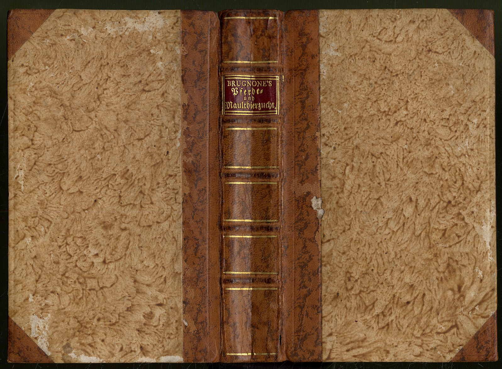 Brugnone, Carlo Giovanni: Werk von der Zucht der Pferde, Esel und Maulthiere und von den gewöhnlichsten Gestüttskrankheiten. Übers. aus dem Italienischen und vermehrt mit einem Anhange von Gottfried Fechner. Mit einer Vorrede begleitet von M. G. Stumpf. Prag, Calve, 1790. Ca. 20 x 12,5 cm. (10) S., 367 Seiten. Mit gestochenem Titel. Halblederband der Zeit mit geprägtem Rückenschild. Erste deutsche Ausgabe. „Zu diesem Buch gaben wohl hauptsächlich seine Beobachtungen bei dem königlichen Gestüte zu Chiavasso Veranlassung.“ (Schrader, Thierärzte 285). Brugnone (1741-1818) war ein Verterinär von großer Bedeutung. er studierte in Alfort und Lyon und leitete die Tierarzneischule in Turin. Vorderdeckel mit minimaler Fehlstelle im Bezug. Mit Exlibris. Am Anfang und Schluss des Buches sind zahlreiche unbeschriebene Seiten (für eigene Notizen) mit eingebunden. Schönes Exemplar.