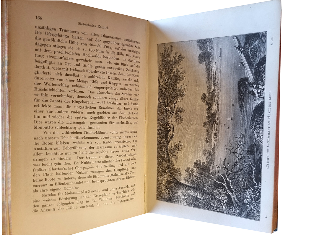 Schweinfurth, Georg: Im Herzen von Afrika. Reisen und Entdeckungen im Centralen Aequatorial-Afrika während der Jahre 1868 bis 1871. Deutsche Originalausgabe. 2 Bände. Leipzig und London, F.A. Brockhaus und Sampson Low, arwston, Low, and Searle, 1874. Ca. 22 x 13,5 cm. XIII S., 599 S., (3) Seiten, mit einer mehrfach gefalteten Karte, einer Farbendrucktafel und 77 Holzschnitten (teils auf Tafeln); XII S., (2) S., 561 Seiten, mit einer Karte und 47 Holzschnitten (teils auf Tafeln). Halbledereinbände der Zeit mit Rückengoldprägung. Erste Ausgabe. Embacher 265; Henze V, 113. Rücken etwas beschabt. Mit Geschenkvermerk auf Vorsatz, Namenszug (bzw. teilradiertem N.) auf Titelblatt. Seiten papierbedingt leicht gebräunt. Jedoch gutes Exemplar. „Klassischen Ruhm erwarb sich Sch. (1836-1925, Afrika-Forscher) durch seine in den Jahren 1868-71 ausgeführte Reise durch das weite Flußnetzgebiet des Bahr el-Ghasal, des linksseitigen größten Tributärs des Weißen Nil. … Sch. blieb es vorbehalten, die Grundlagen der wissenschaftlichen Kenntnis des Bahr el-Ghasal-Gebietes zu schaffen.“ (Henze).