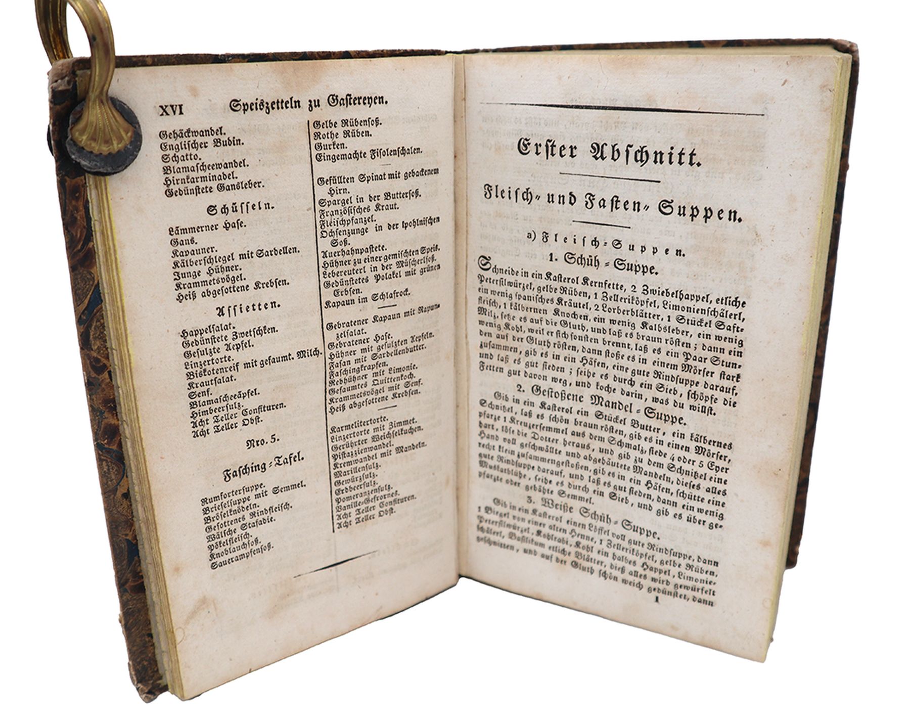 Meixner, Maria Elisabeth: Das neue, große, geprüfte und bewährte Linzer Kochbuch in zehn Abschnitten. Enthält ein tausend sieben hundert und fünfzehn Kochregeln für Fleisch- und Fasttage, sehr deutlich und faßlich beschrieben. Nebst einem Anhange in zwey Abschnitten worin ein allgemeiner Unterricht vom Kochen überhaupt, von der Ordnung, von der Reinlichkeit, von der Zierlichkeit im Anrichten, von dem Fleiße, von der Sparsamkeit, vom Transchiren und Vorlegen gründlich und ausführlich abgehandelt wird. Beygefügt sind noch: Mehrere bequem eingerichtete Speisezetteln, nebst einem vollständigen alphabetischen Register. Siebente, verbesserte und mit 329 Speisen vermehrte Auflage. Linz, Friedrich Eurich und Sohn, 1832. Ca. 18,5 x 11,5 cm. XVI S., 575 Seiten. Mit einem gestochenen Frontispiz. Pappband der Zeit. Vgl. Weiss 2514; Vgl. Alicke 3293 (6. Aufl.). Das beliebte österreichische Kochbuch umfaßt 1715 Rezepte. Das hübsche Titelkupfer zeigt eine Küchenszene. Einband berieben und etwas beschabt. Seiten teils etwas stockfleckig. „Gedünstete Hirschohren: Siede den Hirschkopf im Wasser ab, putze ihn sauber, schneide das Fleisch von den Knochen herab, schneide es schön klein länglich, gib es in ein Reindel, gib Limonieschälerl, ein wenig Muskatblühe, ein halbes Seidel Wein und eben so viel Wasser, etliche ausgelöste Zibeben und Weinbeerl dazu, laß es gut kochen, walze ein Stückel Butter im Mehl, gib es darein, laß es gut versieden, und richte es auf eine Schüssel.“
