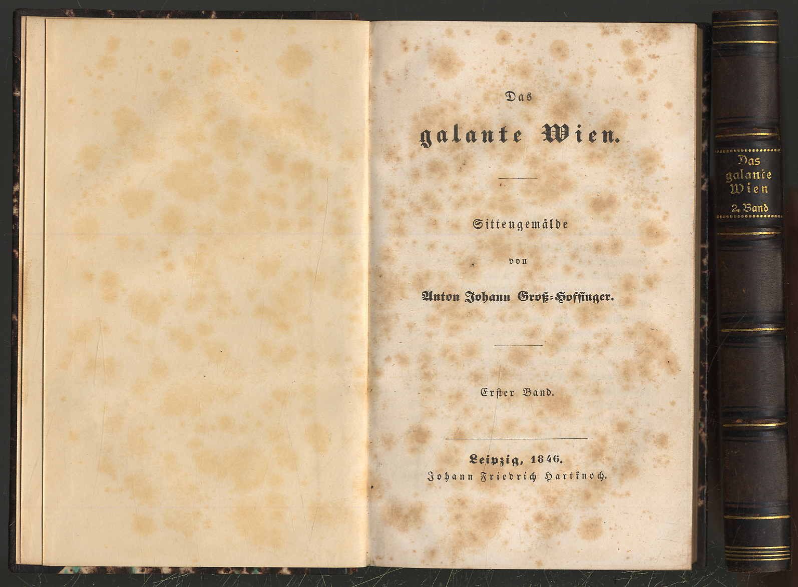 Groß-Hoffinger, Anton Johann: Das galante Wien. Leipzig, Johann Friedrich Hartknoch, 1846. Ca. 18,5 x 11,5 cm. 346 Seiten; 410 Seiten. Halblederbände der Zeit mit Rückengoldprägung. Erste Ausgabe. Titelblätter und einige weitere Seiten stockfleckig, sonst gutes Exemplar. „Wo ist der Frohsinn dieser lustigen Wiener, deren Schwänke alle Fremden ergötzten? Wo der gesunde, harmlose Mutterwitz dieses Völkleins lachender Philosophen? … Man besuche diese Schauplätze der jetzigen Volksvergnügungen, diese Bierhäuser, öffentlichen Gärten, wo ungeheure Menschenmassen bei einer lärmenden Musik schweigend oder flüsternd, so fast traurig beisammen sitzen, viele öffentlichen Bälle, wo statt der sonstigen Fröhlichkeit man jetzt Nichts findet, als ekelhaft brünstige Tänze, in welchen sich thierische Begierden in frechen Umschlingungen zu Tode keuchen. … Nur Wollust und immer wieder Wollust reizt die Nerven dieser depravirten Menschheit. … gedankenloses, blödsinniges Hinbrüten, einfältige Sucht nach zweideutigen Bonmonts, Philisterhaftikeit, geistige Impotenz.“ (Einleitung). Gross-Hoffinger Anton (1808 – nach 1873, Wiener Dichter und Schriftsteller).