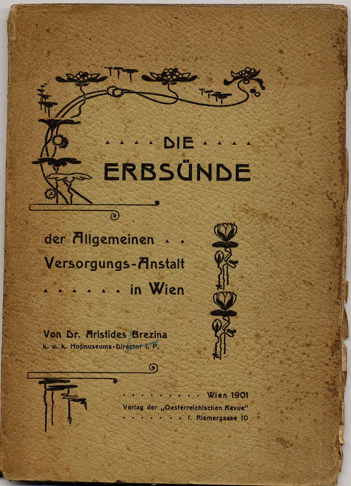 Brezina, Aristides: Die Erbsünde der Allgemeinen Versorgungs-Anstalt in Wien. Wien, Verlag der Oesterr. Revue, 1901. Ca. 21 x 15 cm. 132 Seiten. Illustrierte Originalbroschur. Einband stärker fleckig. Seiten von Hand aufgeschnitten daher angerändert, jedoch breiter weißer Rand vorhanden. Separat-Abdruck aus der „Oesterreichischen Revue“.
