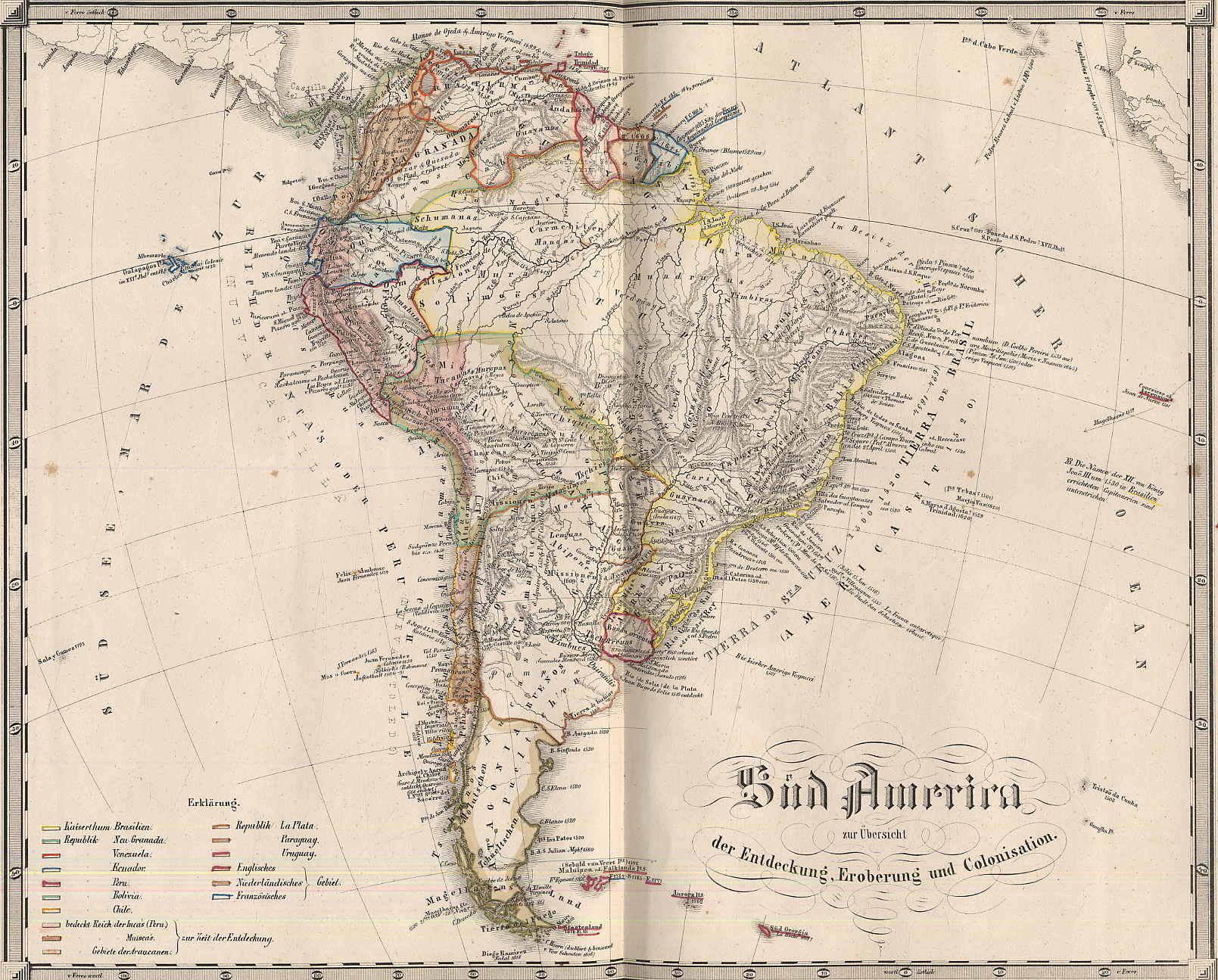 Spruner, Karl v.: Historisch-geographischer Hand-Atlas zur Geschichte Asiens, Africa’s, America’s und Australiens. Achtzehn colorierte Karten nebst erläuternden Vorbemerkungen. Gotha, Justus Perthes, 1853. Ca. 35 x 24,5 cm. 18 colorierte Karten. 12 Seiten Text. Halblederband der Zeit. Aus der Reihe: Spruner’s historisch-geographischer Hand-Atlas, 3. Abtheilung. 1. Auflage. Rücken und Kanten bestoßen, Einband berieben. Tafeln nur vereinzelt wenig stockfleckig. Textseiten gebräunt. 10 gestochene Karten, 8 in Lithographie. Espenhorst: Andree Stieler, Meyer & Co. 2.8.1.2; Espenhorst Petermann’s Planet S. 403. Beinhaltet: 10 Karten zur Geschichte Asiens (u.a. Zeit der Selenciden und des Turk-Reiches der Hiong-nu in Hochasien; Zeit der Sassaniden und des Hunnen-Reiches; Die Reiche der Seldschuken; der Altun-Khane in Hochasien und der Muhametaner in Indien; Die Mongolenherrschaft; Das Reich des Groß-Moguls; die Holländer in Indien; Die Briten in Indien; das Reich er Mandschu); 3 Karten zur Geschichte Africa’s (Africa bis zur Eroberung durch die Araber im VII. Jhrh.; Africa nach den arabischen Geographen und bis zur Ankunft der Portugiesen; Al Magred nach Leo Africanus; Die Colonien auf der Goldküste); 4 Karten zur Geschichte America’s (u.a. Nord-America und Süd-America zur Uebersicht der Entdeckung, Eroberung und Colonisation; America bis 1776; America seit 1776); 1 Karte zur Geschichte Australiens (Australia u. Polynesia zur Uebersicht der Entdeckung und Colonisation). Schön colorierte, doppelblattgroße Karten.