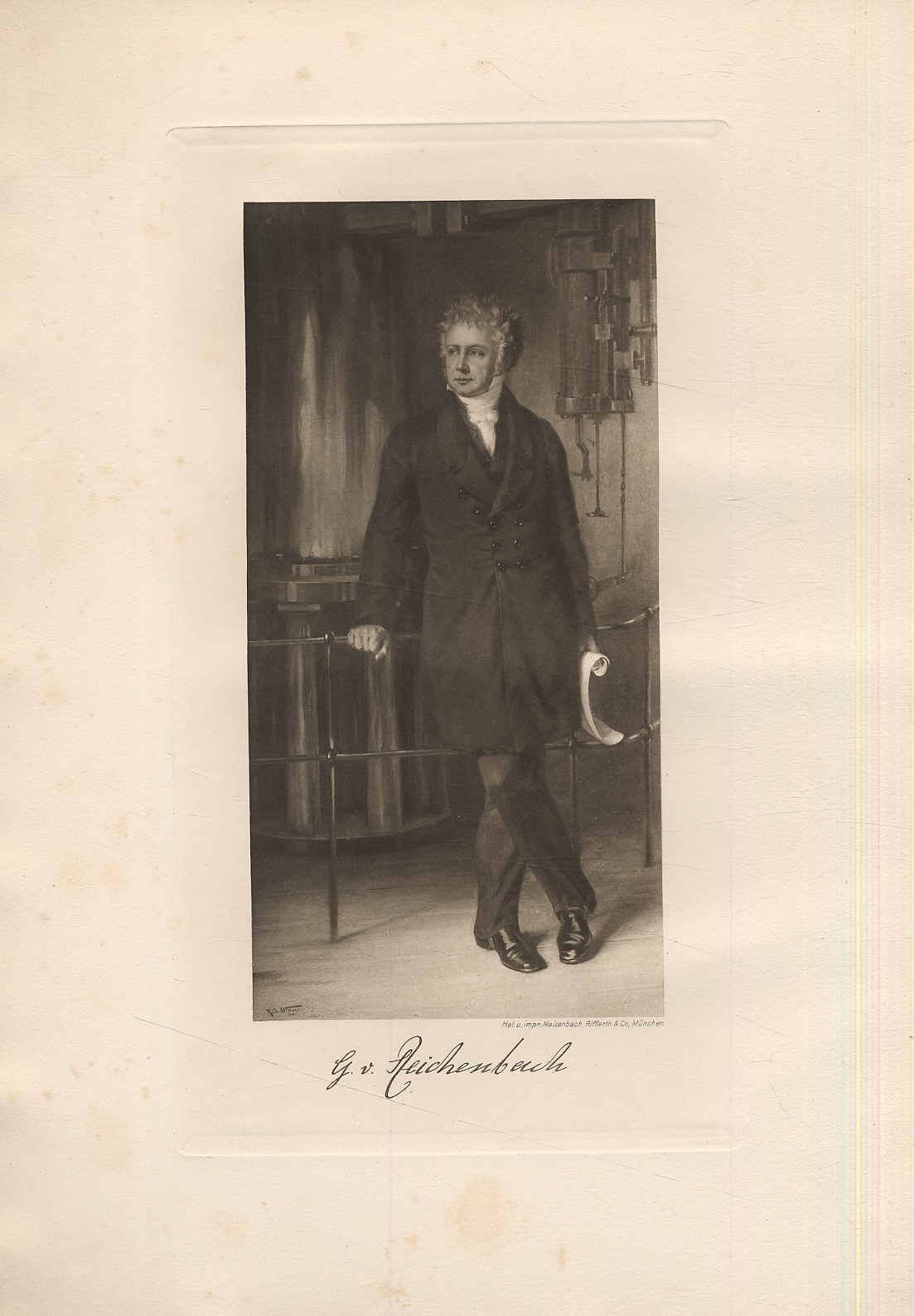 Dyck, Walther von: Georg von Reichenbach. Beigefügt: W. v. Dyck: Georg v. Reichenbach. Vortrag gehalten in der 5. Jahresversammlung des Deutschen Museums. München, Selbstverlag des Deutschen Museums, 1912. 37526 140 Seiten. Mit Titelbild und 8 Tafeln. Orig.-Leinenband. Aus der Reihe: Deutsches Museum, Lebensbeschreibungen und Urkunden. Rücken und Kanten etwas bestoßen. Einband angestaubt und teils fleckig. Unaufgeschnittenes Exemplar. Der Vortrag „Antrag zur Errichtung eines Denkmals im Ehrensaal des Deutschen Museums im Namen des Vorstandsrates vorgelegt in der Ausschußsitzung am 1. Oktober 1908“ als „Probedruck für die Besprechung im Vorstandsrat angefertigt“.