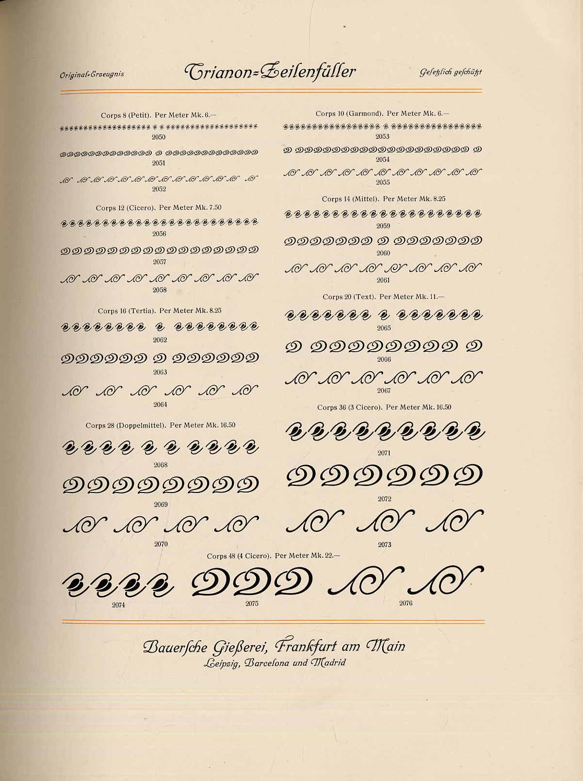 Wieynk, Heinrich: „Trianon“ Schriften und Schmuck nach Zeichnungen von Heinrich Wieynk. Bauersche Gießerei. Frankfurt am Main, ca. 1913. Ca. 29,5 x 23 cm. (32) Seiten mit teils farbigen Beispielen. Farbig illustrierter Orig.-Karton. Hinterdeckel gelocht und mit Knick, sonst sehr gutes Exemplar. Beigefügt der gedruckte Hinweis, dass die „in dieser Probe genannten Grundpreise“ ungültig sind.
