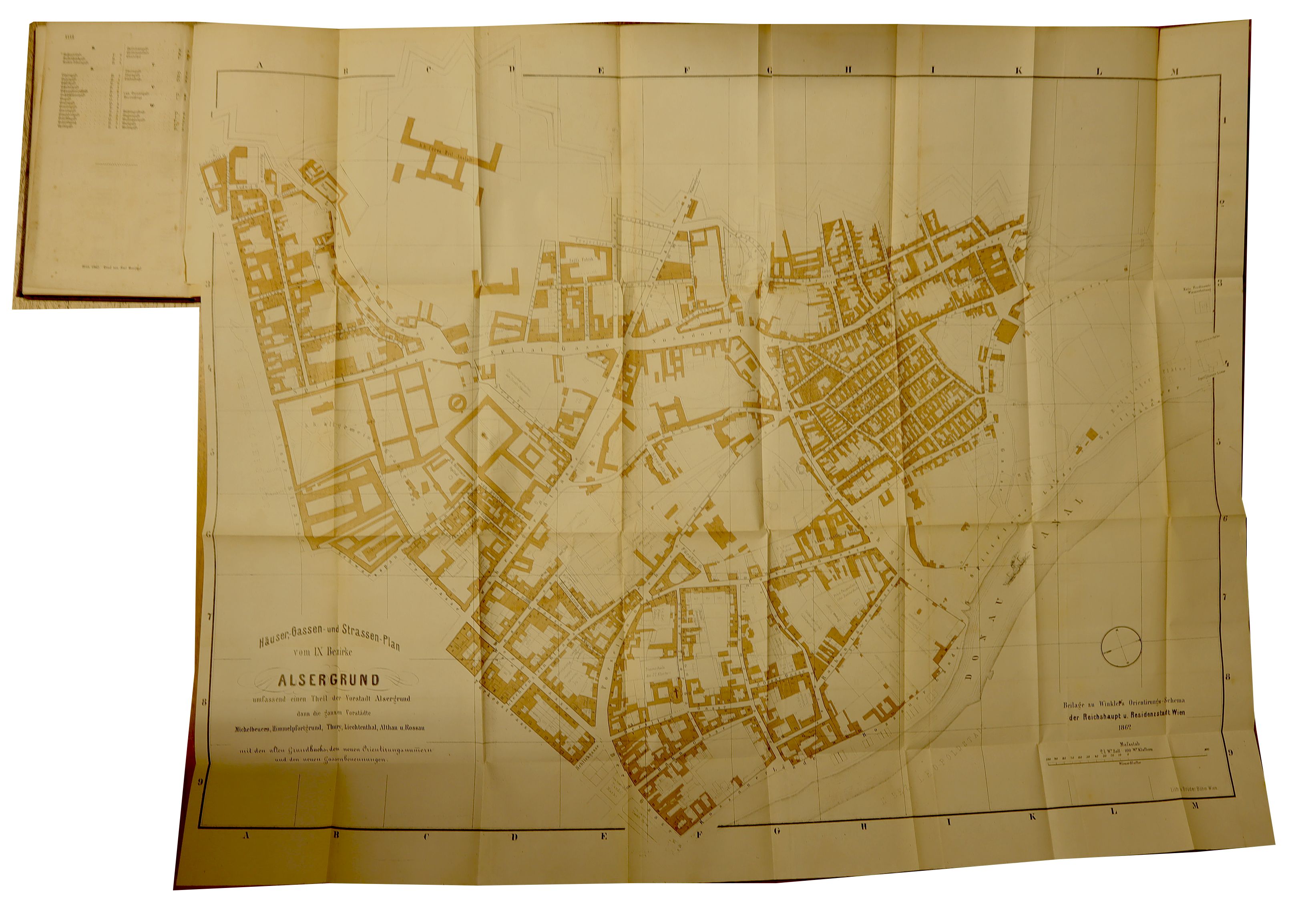 Winkler, Michael: IX. Bezirk. Alsergrund. Nachweis der alten und neuen Benennungen der Gassen, Straßen und Plätze in alphabetischer Ordnung. Wien, Karl Gorischek, 1862. Ca. 21 x 13,5 cm. Der 9. Teil von Seite 961 bis Seite 1112. Mit einem sehr großen farbig lithographiertem Plan. Leinenband der Zeit. Aus der Reihe: Winkler’s Orientirungs-Plan der k. k. Reichshaupt- und Residenzstadt Wien: mit ihren acht umliegenden Vorstadt-Bezirken]. Ohne den Reihentitel. Etwas gebräunt und teils etwas stockfleckig. Winkler „veröffentliche 1862/63 auch ein Orientierungsschema mit entsprechenden Planbeilagen, das die alten u. die neuen Nummern enthielt u. noch heute für die Umrechnung von alten Hausnummern unentbehrl. ist.“ (Czeike, S. V, 662).