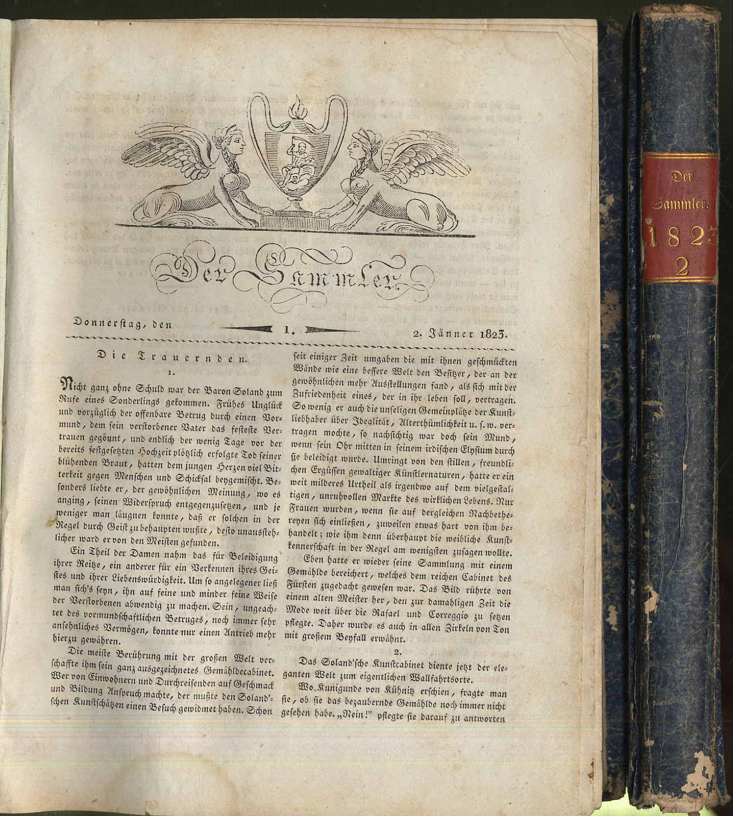 Der Sammler. [Ein Unterhaltungsblatt]. 2 Bände. Wien, A. Strauß, 1823. Ca. 27,5 x 21,5 cm. 624 Seiten + 4 Seiten Beilage zu Heft 122. Pappbände der Zeit mit Rückenschild. 156 Hefte, Jahrgang 1823. „Der Sammler schließt Alles aus, was rein wissenschaftlichen Inhaltes ist. Er will unterhalten und nur in dieser Einkleidung Kenntnisse verbreiten. […] Erzählungen (Wahrheit und Dichtung), Schilderungen von Ländern und Städten, Sitten und Gebräuchen, von Natur- und Kunstschönheiten, Lebensbeschreibungen von Männern und Frauen, die durch bedeutende Rollen die öffentliche Aufmerksamkeit auf sich zogen, Anecdoten, […] humoristische Aufsätze, Gedichte, Notizen von neuen Erscheinungen im Gebiethe der Literatur, der Kunst, der Mode; Belohnungen, Ehrenbezeugungen, Beförderungen berühmter Staatsmänner, Schriftsteller und Künstler – dieses wird der Inhalt des Sammlers seyn […]. Aber der Unternehmer wird damit auch eine fortlaufende räsonirende Übersicht der Theater dieser Hauptstadt (freymüthig und bescheiden) verbinden, und überhaupt nie aus dem Auge verlieren, daß diese Zeitschrift zunächst für die Bewohner der k. k. Staaten bestimmt ist.“ (Wiener Zeitung, 11.1.1809, S. 157). Einbandkanten etwas bestoßen. Seiten an den Rändern etwas wasserfleckig.