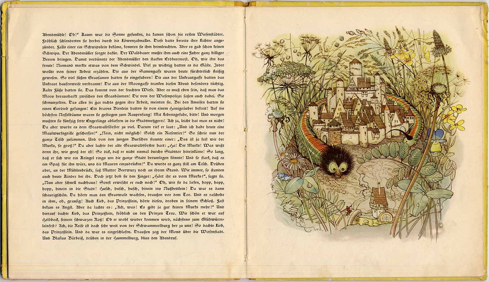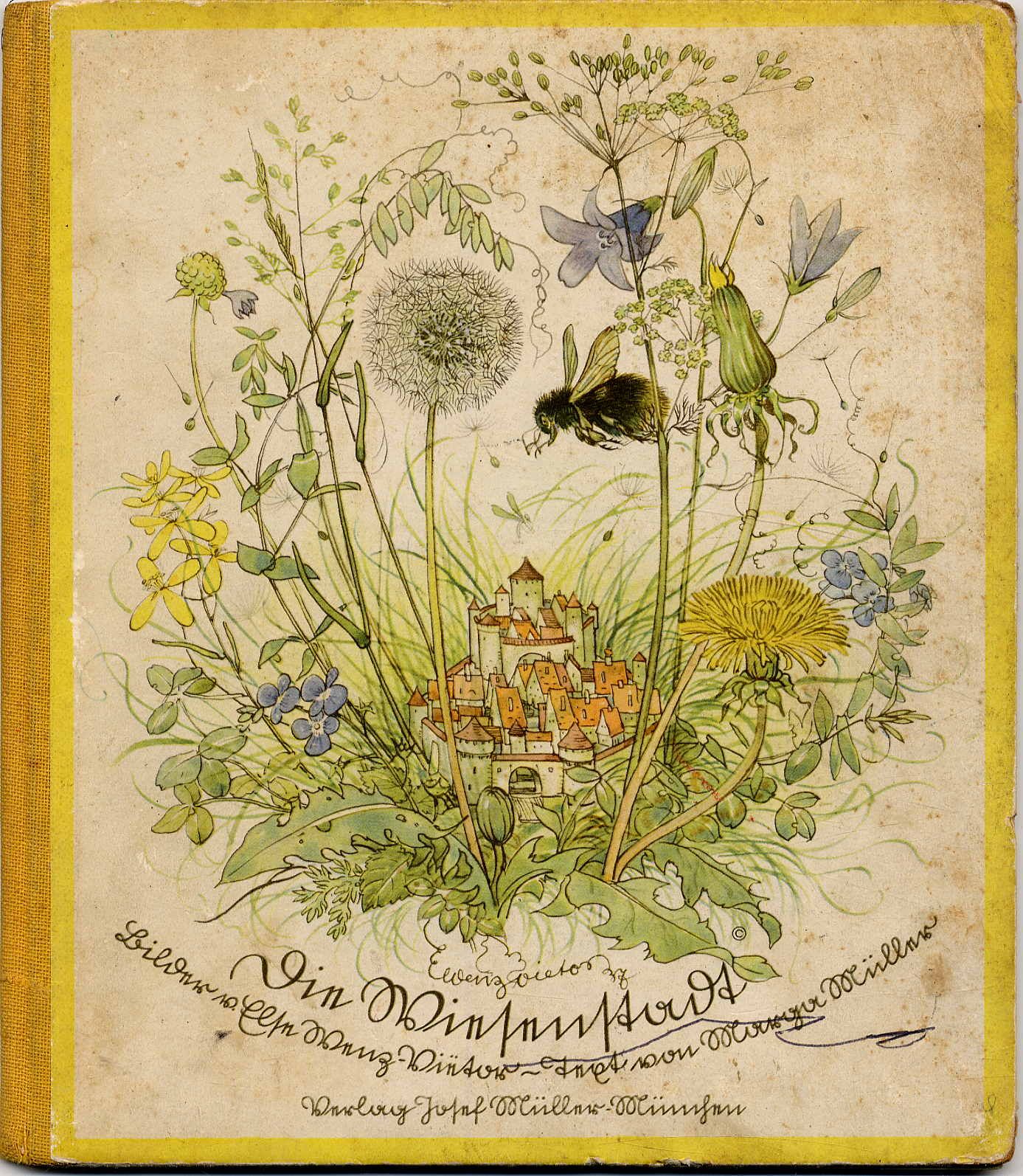 Müller, Marga: Die Wiesenstadt. München, Josef Müller, 1937. Ca. 23,5 x 20,5 cm. (16) Seiten. Mit zahlreichen, davon 7 ganzseitigen farbigen Bildern von Else Wenz-Vietor. Farbig illustr. Orig.-Halbleinenband. Reetz 103. Einband etwas fleckig und Kanten teils bestoßen. Stempel auf Titelblatt. Buchblock etwas gelockert. „Die von der Wiesenpolizei saßen auch dabei. … Bei den Ameisen hatten sie einen Eierdieb gefangen! Ein braves Bienlein hatten sie von einem Honigräuber befreit! Auf die höchsten Nesselbäume waren sie gestiegen zum Raupenfang! Mit Lebensgefahrt, bitte! Und morgen mußten sie fünfzig fette Engerlinge abliefern in die Stadtmetzgerei.“