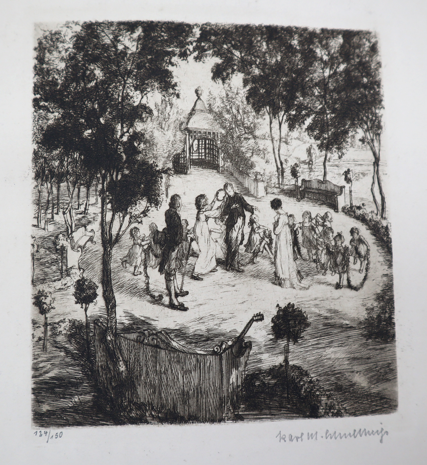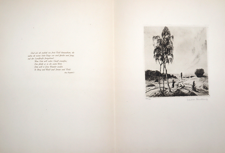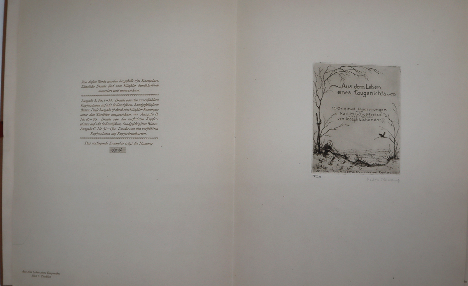 Schultheiss – Eichendorff, Joseph v.: Aus dem Leben eines Taugenichts. 10 Originalradierungen von Karl M. Schultheiss mit begleitenden Textausschnitten aus der Novelle von Joseph Freiherrn von Eichendorff. Berlin, Wohlgemuth & Lissner, Ca. 32,5 x 25 cm. 16 Doppelblätter, auf der rechten Seite jeweils mittig platziert 16 Originalradierungen von Karl M. Schultheiss. Orig.-Leinenmappe. Mappe Rücken und Kanten etwas bestoßen. Rücken der Doppelblätter etwas stockfleckig, sonst gutes Exemplar. Exemplar 123/150. Jede Radierung handschriftlich nummeriert und vom Künstler signiert. Der begleitende Textausschnitt jeweils auf der linken Seite.