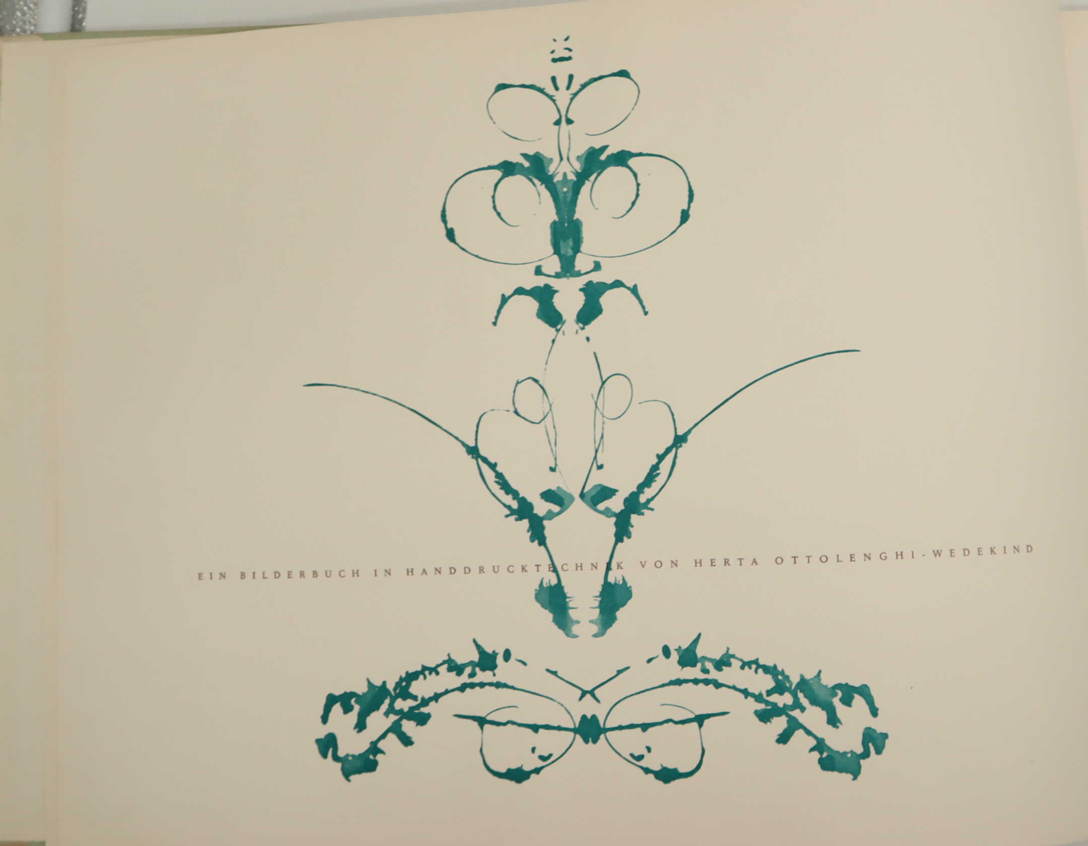 Ottolenghi, Astolfo (Hrsg.): Ranken und Masken (Rückentitel). Ein Bilderbuch in Handdrucktechnik von Hertha Ottolenghi-Wedekind. Davos, Druck in der Graphischen Werkstätte Buchel, 1957. Querformat, ca. 30 x 41 cm. (58) Seiten mit farbigen Illustrationen sowie einer montierten fotografischen Abbildung. Orig.-Halbpergamentband. „Dem Gedächtnis meiner lieben Mutter gesammelt und herausgegeben“. Exemplar Nr. 20 einer wohl sehr kleinen Auflage. Auf dem Vorsatz mit handschriftlicher Widmung, signiert „Astolfo“, datiert 15. Juni 1969. Einband minimal fleckig, sonst gutes Exemplar. Zeigt Figürliches und „leicht hingeworfene“ Ornamente der Künstlerin Herta Ottolenghi-Wedekind (1885-1953). Herta Ottolenghi Wedekind, eine gebürtige Berlinerin, zählt zu den wichtigsten Kunstgewerblerinnen der 1920er und 1930er Jahre. Um 1920 verfeinerte sie ein Verfahren zur Übertragung abstrakter, spiegelsymmetrischer Motive auf Textilien, das ihr große Bekanntheit einbrachte.