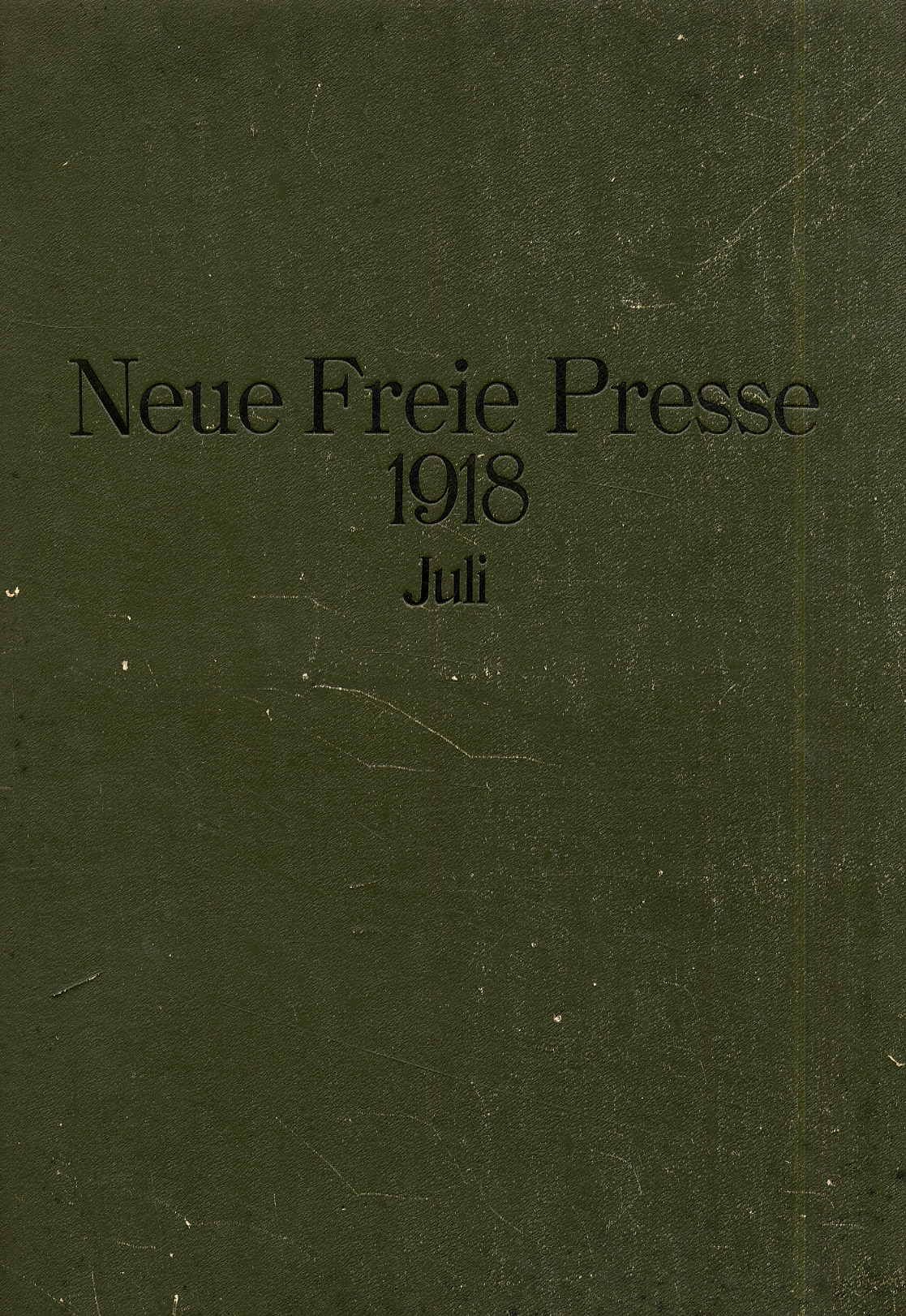 Neue Freie Presse. Juli 1918. Wien, 1918. Ca. 46 x 31 cm. Je Ausgabe zwischen 4 und 20 Seiten. Grüner Leineneinband mit geprägtem Deckeltitel. Einband berieben. Die „Neue Freie Presse“ wurde am 1. September 1864 von Michael Etienne und Max Friedländer gegründet und entwickelte sich zur bedeutendsten liberalen Zeitung Österreichs. Unter Chefredakteur Moriz Benedikt (1849-1920) nahm sie großen Einfluss auf die Politik und veröffentlichte Beiträge namhafter Autoren. Sie erschien zweimal täglich (es gab jedoch auch Morgen- Nachmittags- und Abendblätter) und brachte neben Politik auch Feuilletons, und Nachrichten aus der Wirtschaft sowie Werbeanzeigen. Die Zeitung erschien durchgehend bis zum 31. Januar 1939. Ab 1. Februar 1939 wurde sie mit anderen Blättern zum Neuen Wiener Tagblatt fusioniert.– In unserem Bestand befinden sich mehrere Bände dieser Zeitschrift, die Bände sind nicht durchgehend collationiert, eventuell fehlen einzelne Ausgaben.