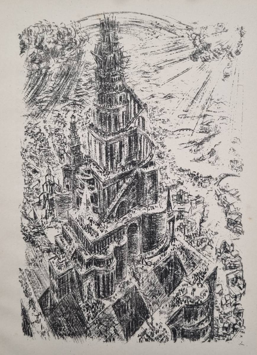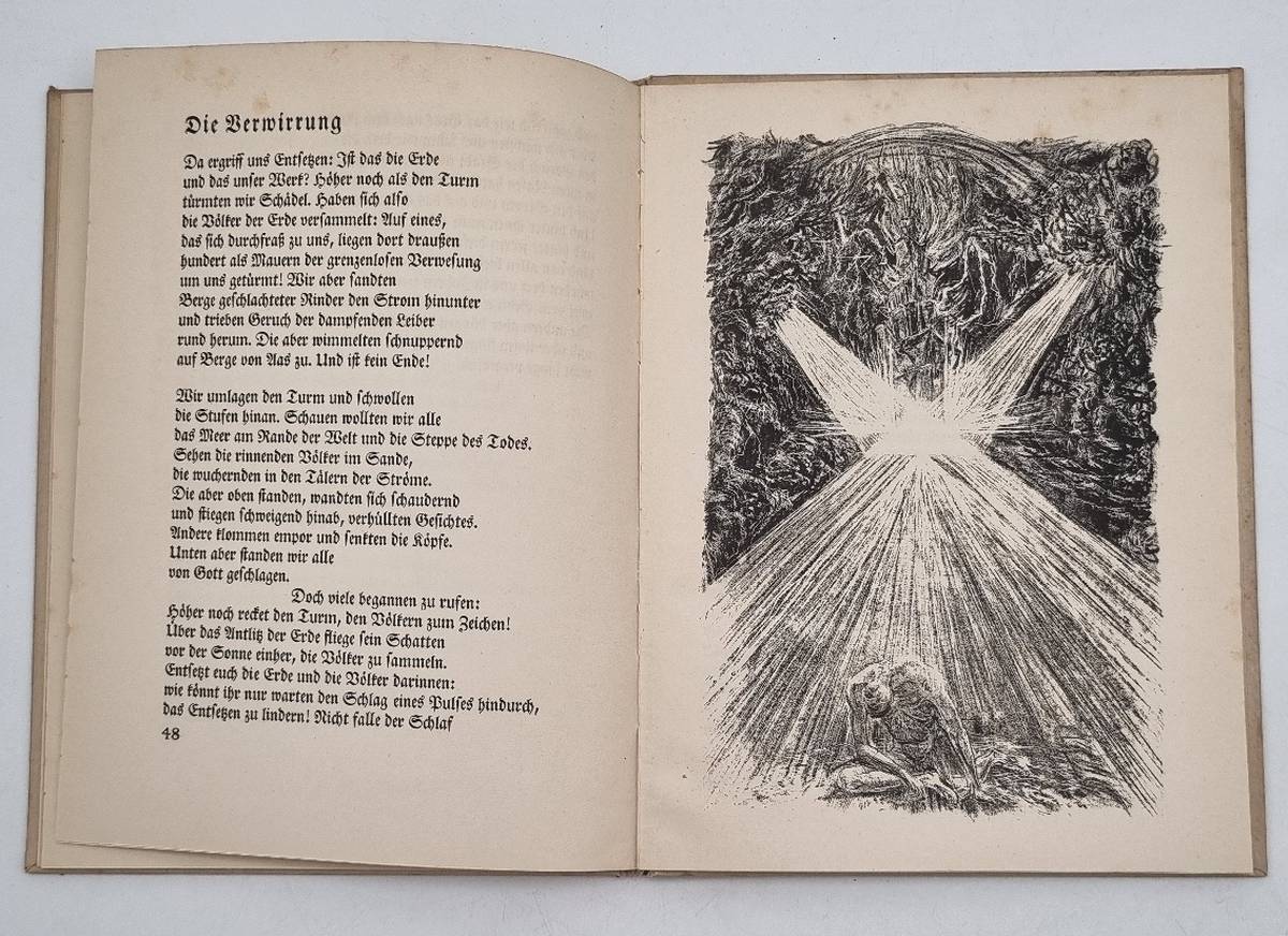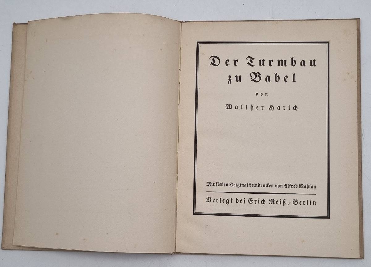 Harich, Walther: Der Turmbau zu Babel. Berlin, Erich Reiß, 1920. Ca. 25 x 19 cm. 57 S., (2) Seiten. Mit sieben Originalsteindrucken von Alfred Mahlau. Orig.-Pappband. Die Lithographien in der Platte datiert und signiert. Einband etwas gebräunt, Rücken bestoßen. Hinterdeckel mit leichtem roten Fleck. Mit schönem Exlibris. Seiten teils vereinzelt leicht stockfleckig.