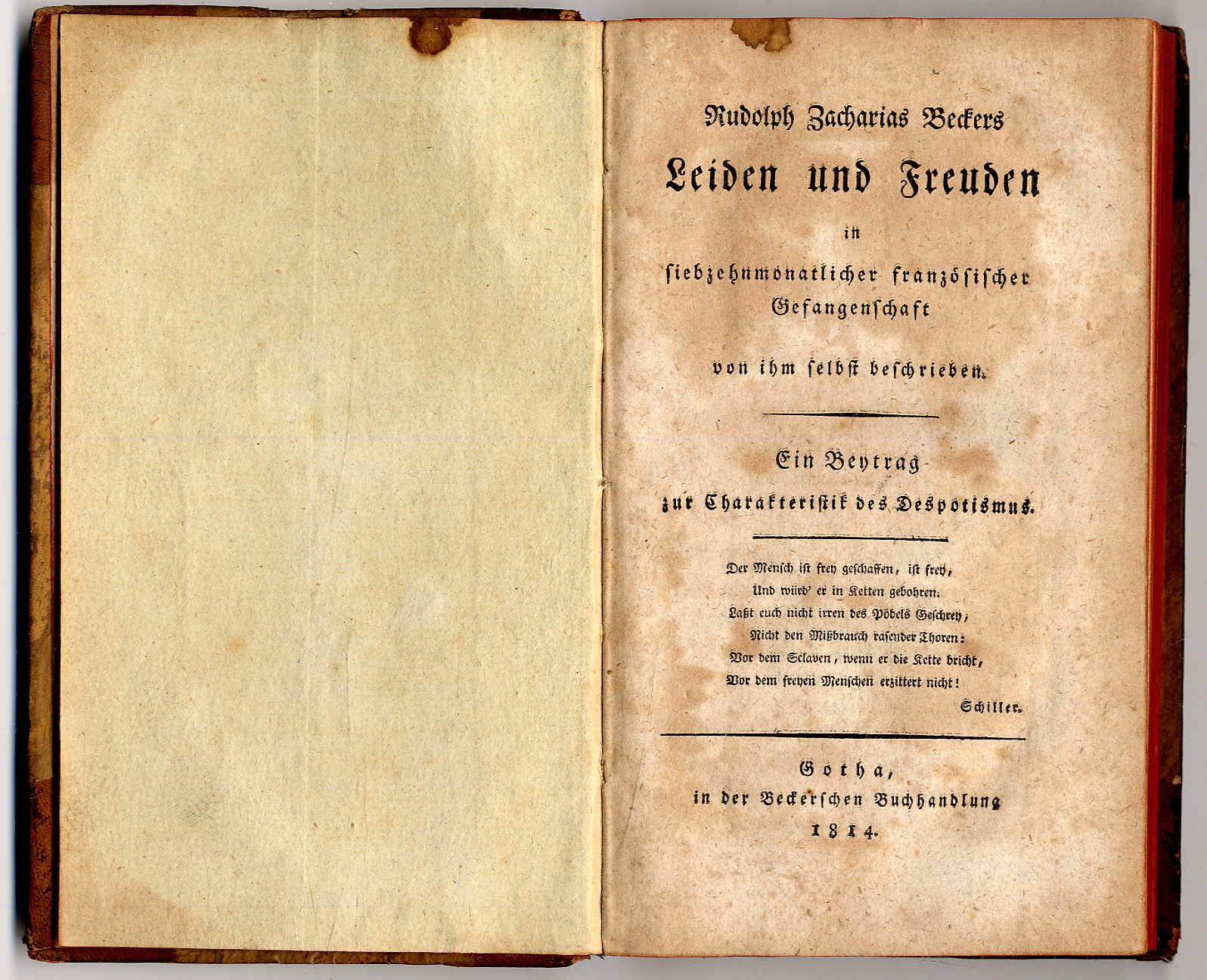 Becker, Rudolf Zacharias: Leiden und Freuden in siebzehnmonatlicher französischer Gefangenschaft von ihm selbst beschrieben. Ein Beytrag zur Chrakteristik des Despotismus. ein Beytrag zur Charakteristik des Despotismus. gotha, Beckersche Buchhandlung, 1814. Ca. 18 x 11 cm. 206 S., (2) Seiten. Halblederband der Zeit. Rücken mit kleinen Fehlstellen. Vorsätze leimschattig, Seiten stärker gebräunt. Der Schriftsteller und Verlagsbuchhändler Becker (1752-1822) wurde am 30. November 1811 „durch französische Gendarmen, wegen eines Aufsatzes in der „National-Zeitung“ verhaftet und nach Magdeburg gebracht, wo er bis zum April 1813 blieb, bis ihm die Verwendung des Herzogs von Gotha bei Napoleon I. wieder die Freiheit brachte.“ (E. Kelchner in ADB 2, 228).