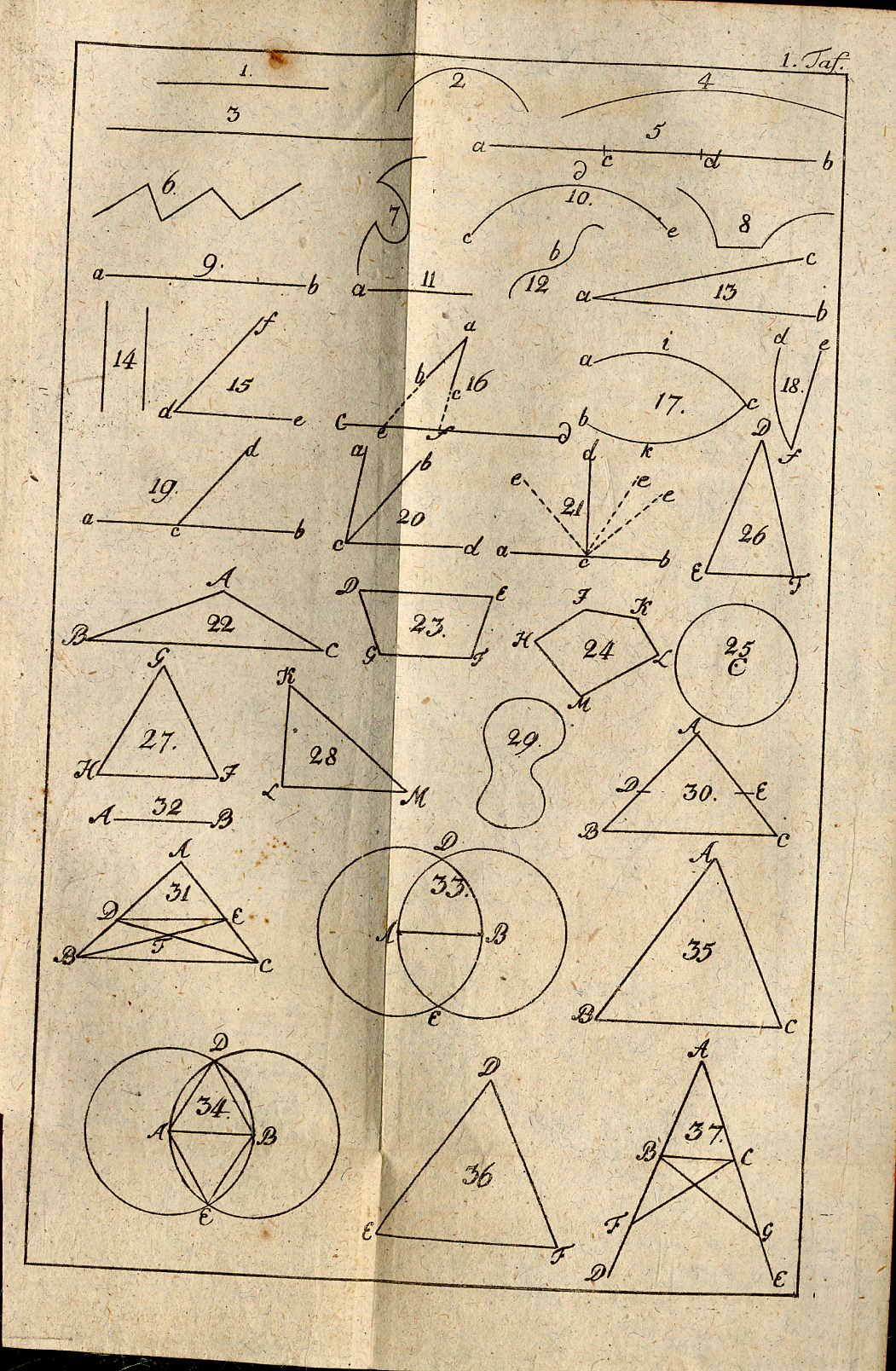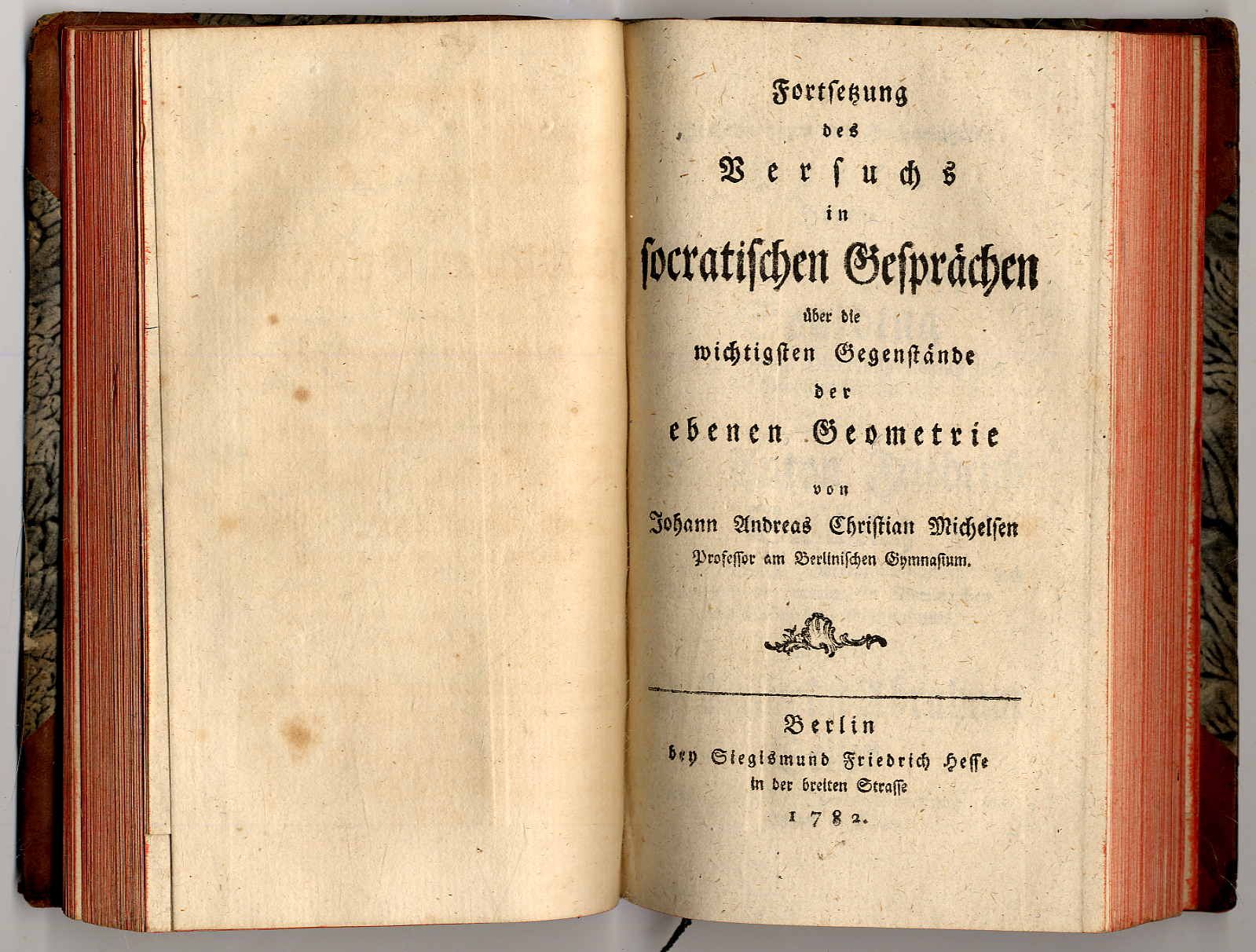 Michelsen, Johann Andreas Christian: Versuch in socratischen Gesprächen über die wichtigsten Gegenstände der ebenen Geometrie; Fortsetzung der Versuche … 2 Teile in einem Band. Berlin, Siegismund Friedrich Hesse, 1781-1782. Ca. 17 x 10,5 cm. (2) S., 124 Seiten; X S., 163 Seiten. Mit 7 teils gefalteten Kupferstichtafeln. Halblederband der Zeit. Michelsen (1749-1797, Mathematiker). Zwei weitere (hier nicht vorliegende)Fortsetzungsbände erschienen 1783 und 1784. Leder teils mit Fehlstellen. Mit Exlibris.