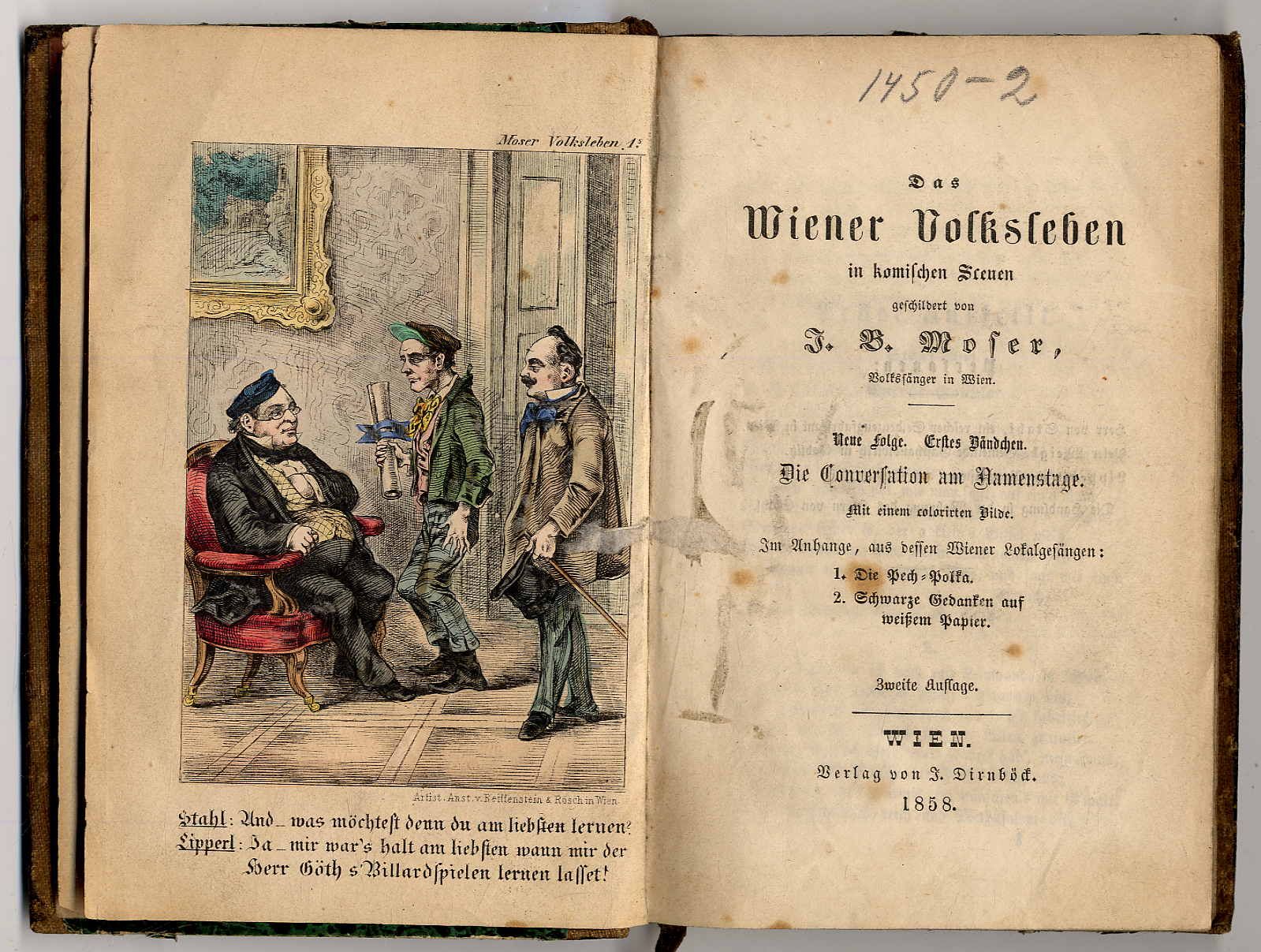 Moser, J[ohann] B[aptist]: Das Wiener Volksleben in komischen Scenen geschildert. Neue Folge, erstes bis sechstes Bändchen in einem Band. (1. Heft in 2. Auflage). Wien, J. Dirnböck, 1858-1860. Ca. 17 x 12 cm. Je Heft 32 – 50 Seiten. Jeweils mit handcoloriertem Titelbild. Halbleinenband der Zeit. 1. Die Conversation am Namenstage; 2) Die Conversation im Paradeisgartel; 3) Die Conversation im Versatzamte; 4) Die Conversation durchs Fremdenblatt; 5) Die Conversation im Glashause; 6) Advokat und Klient oder: Fiaker und Sesseltrager. Jedes Bändchen mit den Anhängen „aus dessen Lokalgesängen“. Einband berieben. Innendeckel mit Aufkleber der Leihbibliothek von J. Dirnböck in Wien. Seiten teils etwas fleckig. Tafeln mit kräftiger Coloratur.