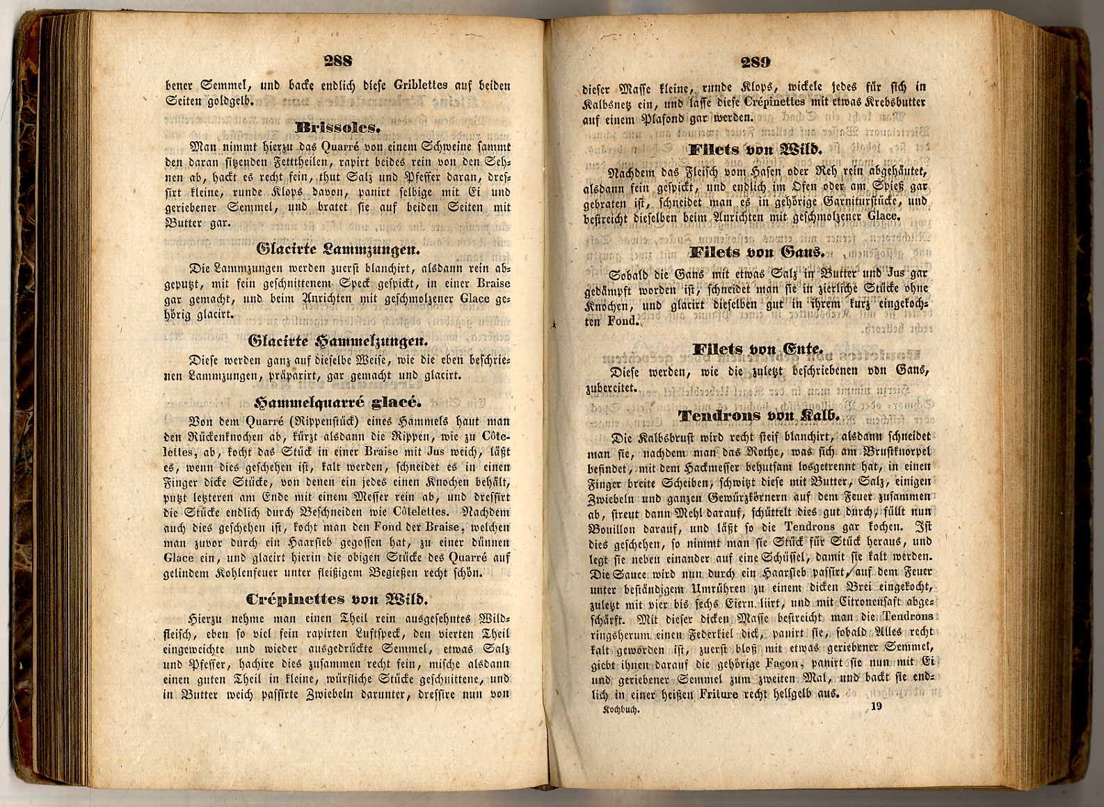 Hauptner, F[erdinand] V[alentin]: Kochbuch für Haushaltungen aller Stände. Berlin, A.W. Hayn, 1838. Ca. 20,5 x 12,5 cm. XII S., 863 Seiten. Halblederband der Zeit. Erste Auflage. Alicke 3192; Horn/Arndt 464; Weiss 1479 (jeweils verschiedene Auflagen). Einband berieben, Kanten und Rücken stärker bestoßen bzw. beschabt. Innendeckel mit Stempel eines Vorbesitzers. Seiten teils etwas stockfleckig. Einige Blätter mit Wurmspuren im unteren weißen Rand. Der Autor war Hofküchenmeister beim Prinzen Albrecht von Preußen und Vorsteher eines Lehr-Institus der Kochkunst für Damen. Einband minimal berieben. „Lachs in Papierkästchen: Bestreiche den Boden kleiner Papierkästchen mit einem leichten Farce von Fischen, welcher mit fein gehackten Kräutern, als z.B. Petersilie, Estragon, Chalotten u.s.w., vermischt ist, wie einen Federkiel dick, lege eine Scheibe geräucherten, guten Rheinlachs darauf, bestreiche diese oben gleichfalls mit dem Farce von Fischen, streue alsdann geriebenen Parmesankäse darauf, beträufele diesen mit Krebsbutter, und lasse dies im Ofen backen.“