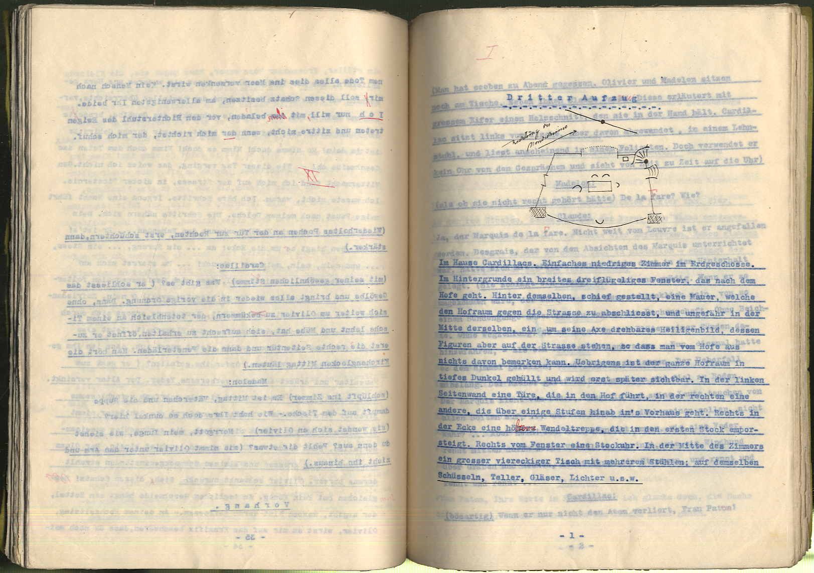 Spigl, Friedrich: Cardillac. Schauspiel in fünf Aufzügen. Maschinenschriftliches (Typoskript) Regiebuch für die Theaterbühne mit einigen, zum Teil gezeichneten, Anweisungen sowie Textkorrekturen in roter Tinte. [Wien, um 1930]? Ca. 29 x 23 cm. Ca. 165 Seiten. Broschierter Einband der Zeit mit handschriftlichem Titel „Correcturen“. Das Typoskript auf dünnem Durchschlagpapier hergestellt von „Blitz“, beh. konz. Maschinenschreib- u. Vervielfältigungsbureau in Wien. Einband angerändert.