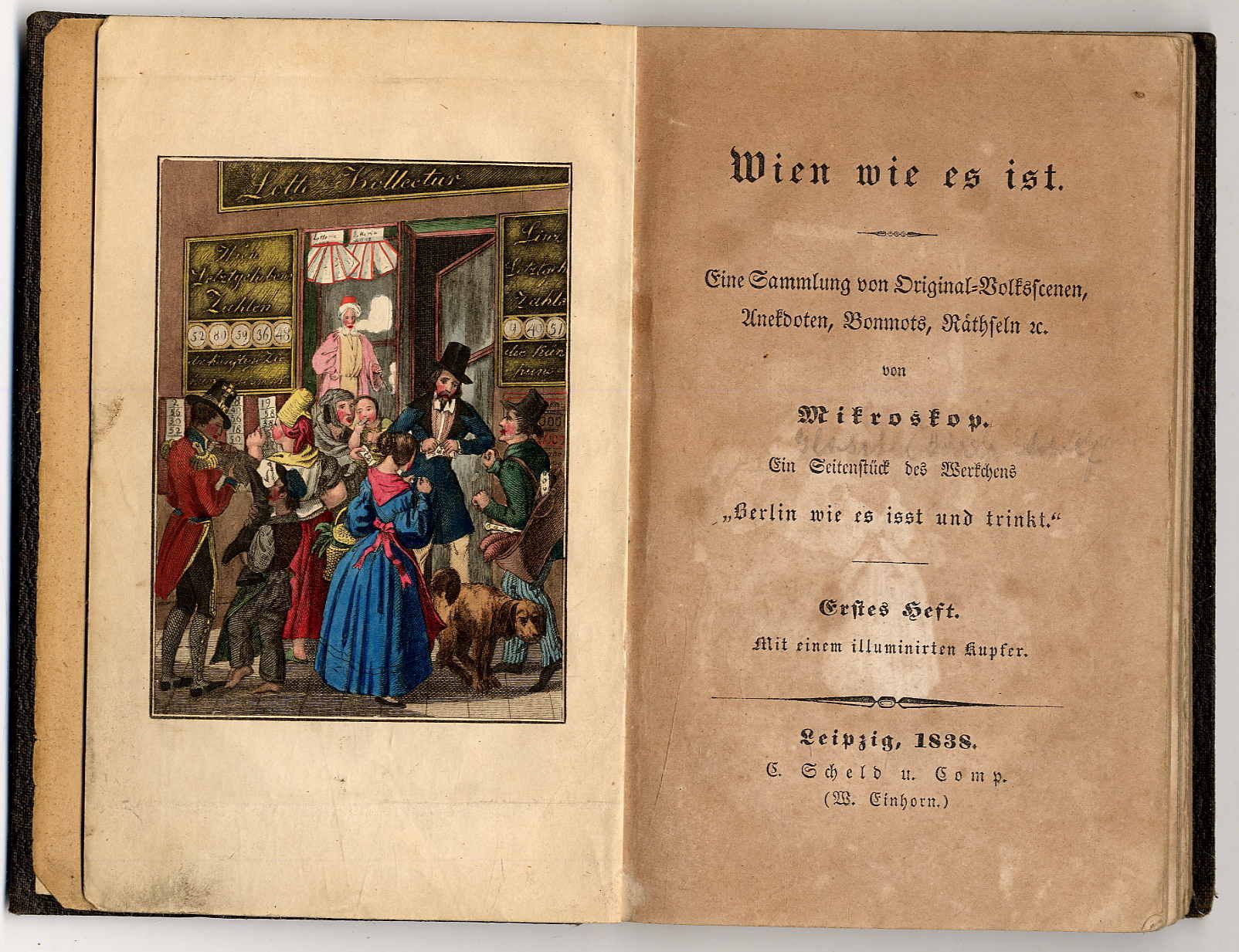 Mikroskop (d.i. Eduard Maria Hügel): Wien wie es ist. Eine Sammlung von Original-Volksscenen, Anekdoten, Bonmots, Räthseln etc. Ein Seitenstück des Werkchens „Berlin wie es isst und trinkt“. 3 (von 4) Hefte in einem Band. Leipzig, C. Scheld u. Comp., 1838. Ca. 17 x 11 cm. 64 Seiten, 64 Seiten, 48 Seiten. Mit 2 (von 3) handcolorierten Kupferstich-Titelbildern. Einfacher Leinenband der Zeit. Das Titelbild zum 1. Heft zeigt eine größere Menschengruppe vor einer Lottoannahmestelle; das Titelbild zum 3. Heft zeigt einen Hausmeister mit Laterne und drei betrunkene Studenten, die Einlass verlangen. Seiten stark gebräunt und teils stockfleckig, ohne das Titelbild zu Heft 2.