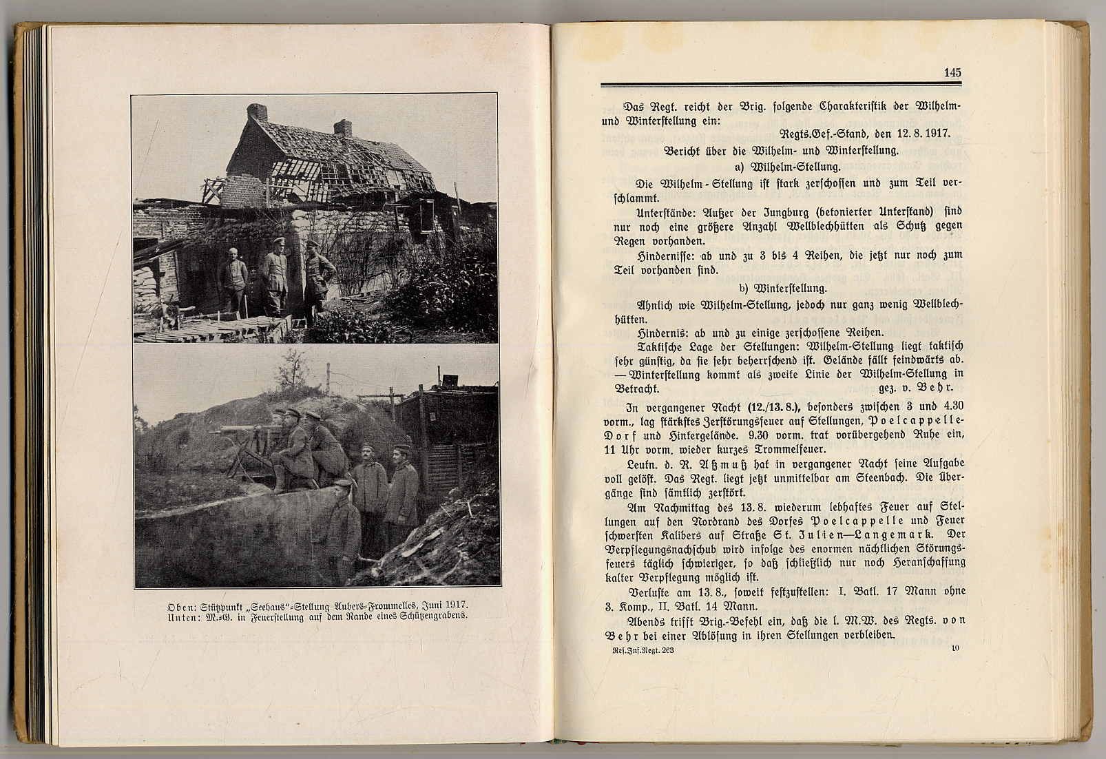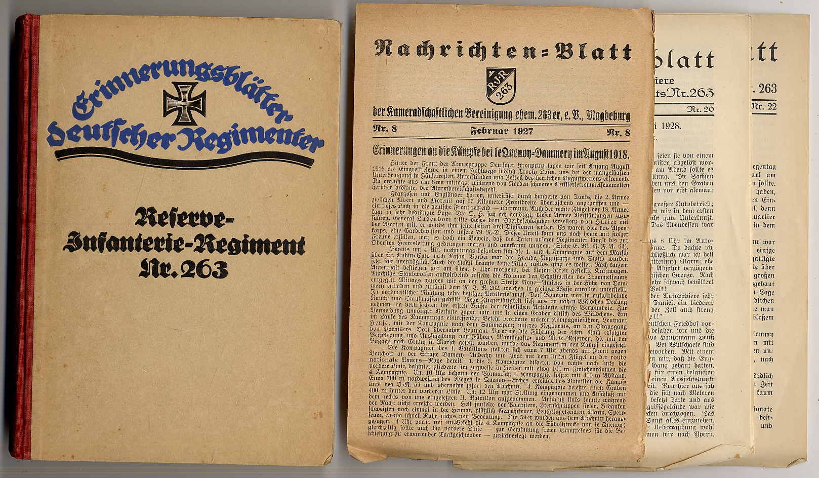Heinecke, Karl und Bruno Bethge: Das Reserve-Infanterie-Regiment Nr. 263 in Ost und West. Nach den amtlichen Kriegstagebüchern und persönlichen Aufzeichnungen und Erinnerungen bearbeitet. Oldenburg u. Berlin, Gerhard Stalling, 1926. Ca. 22 x 15,5 cm. 257 Seiten. Mit 11 Karten, 3 Skizzen und 60 Abbildungen. Orig.-Halbleinenband. Aus der Reihe: Erinnerungsblätter deutscher Regimenter, 187. Band. Beigefügt: 2 Nachrichtenblätter (Nr. 20 und 22) der Vereinigung der Offiziere des Reserve-Infanterie-Regiments Nr. 263. Beigefügt: Nachrichten-Blatt der Kameradschaftlichen Vereinigung ehem. 263er e.V. Magdeburg, Nr. 8. Einband und Vorsatz etwas fleckig, jedoch guter Zustand.