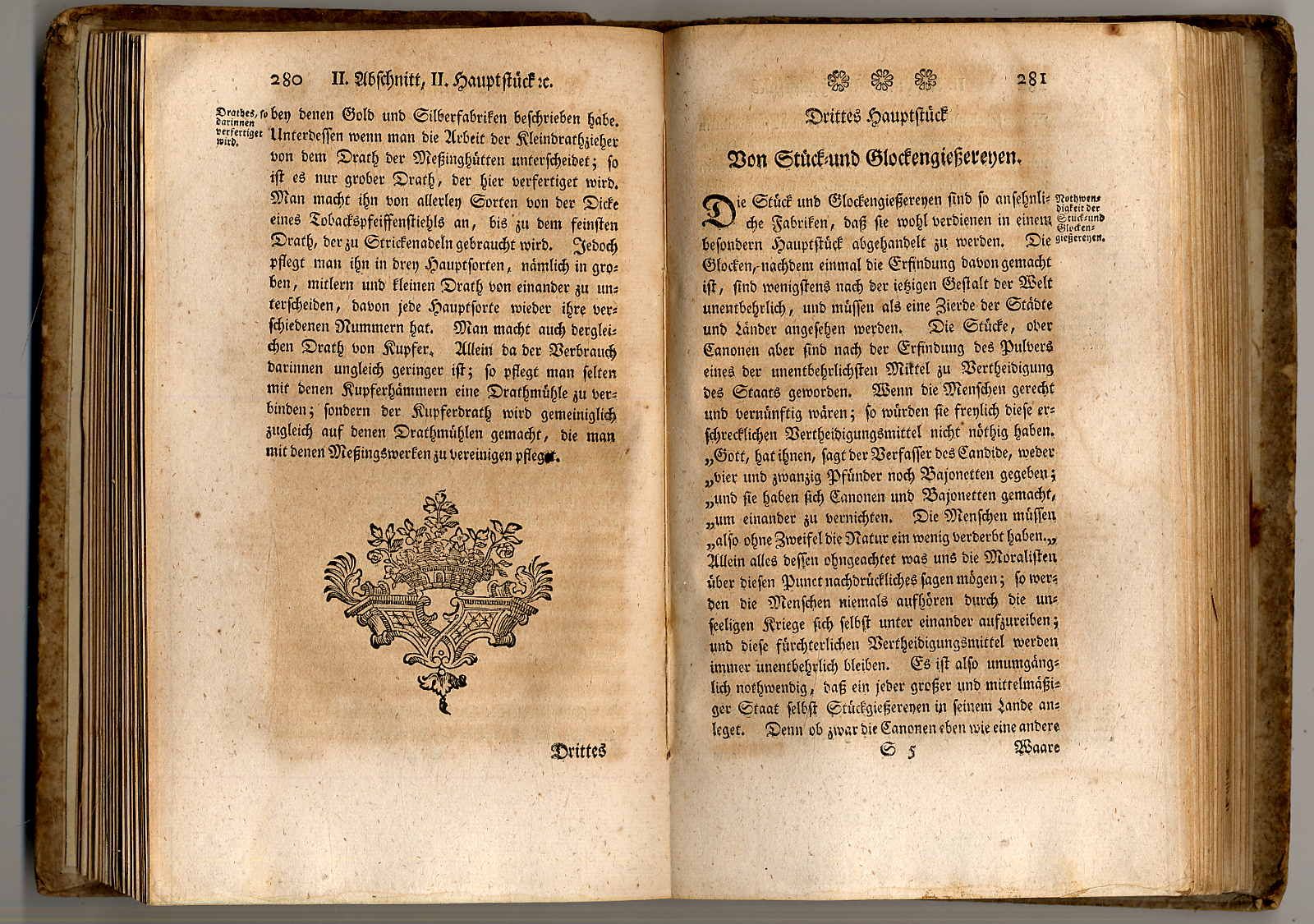Justi, Johann Heinrich Gottlob v.: Vollständige Abhandlung von denen Manufacturen und Fabriken. Zweyter Theil, welcher alle einzelne Manufacturen und fabriken nach der Eintheilung ihrer Materialien abhandelt. Koppenhagen, Rothensche Buchhandlung, 1761. Ca. 21 x 13,5 cm. (16) S., 562 S., (30) Seiten Register. Einfacher Pappband der Zeit. Einband stark fleckig. Seiten gebräunt, teils stockfleckig bzw. wasserrandig. Einige Seiten am Schluss mit braunem Fleck am Rand. Der erste (hier nicht vorliegende) Band erschien 1758. Aus dem Inhalt u.a.: Wollenmanufacturen, Tuchmanufacturen, Zeugmannmanufacturen, Leinenmanufacturen, Leinewandmanufacturen, Seidenmanufacturen, Gold- und Silberfabriken, Drahtziehern und dergleichen Fabricaturen, Kupfer- und Meßinghämmern, Stück- und Glockengießereyen, Eisenhütten und Eisengießereyen, Staab- und Blechhämmern, von den ächten Porcelanfabriken, von unächten Porcelanfabriken, Glasfabriken, Alaun- und Vitriolsiedereyen, Blaufarbenwerken, Zinnober- und Sublimatfabriken, von Bleyweiß, Mennige, Grünspan etc., Papier und andern Fabricaturen.