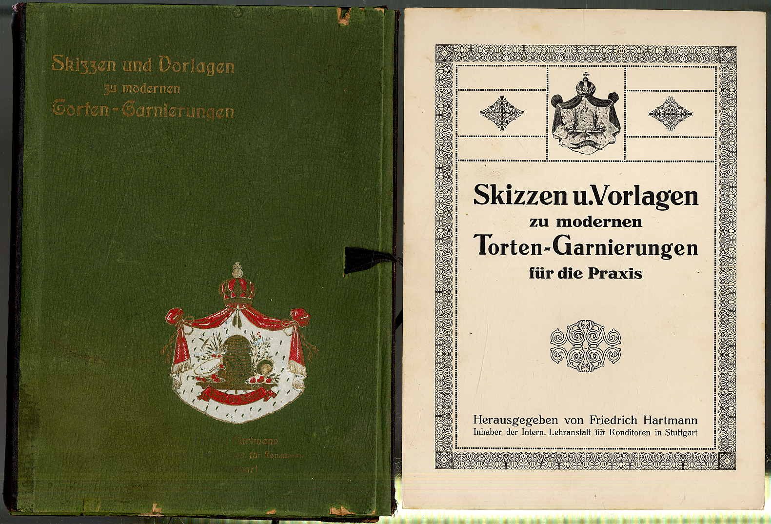 Hartmann, Friedrich (Hrsg.): Skizzen u. Vorlagen zu modernen Torten-Garnierungen für die Praxis. Stuttgart, 1909. Ca. 25,5 x 18,5 cm. 60 Blätter mit 58 Vorlagen auf festem Papier. Orig.-Halbleinenmappe. Mappe an den Rändern und Flügeln etwas beschädigt. Tafeln teils leicht stockfleckig, jedoch gutes Exemplar. Weiss 1456.