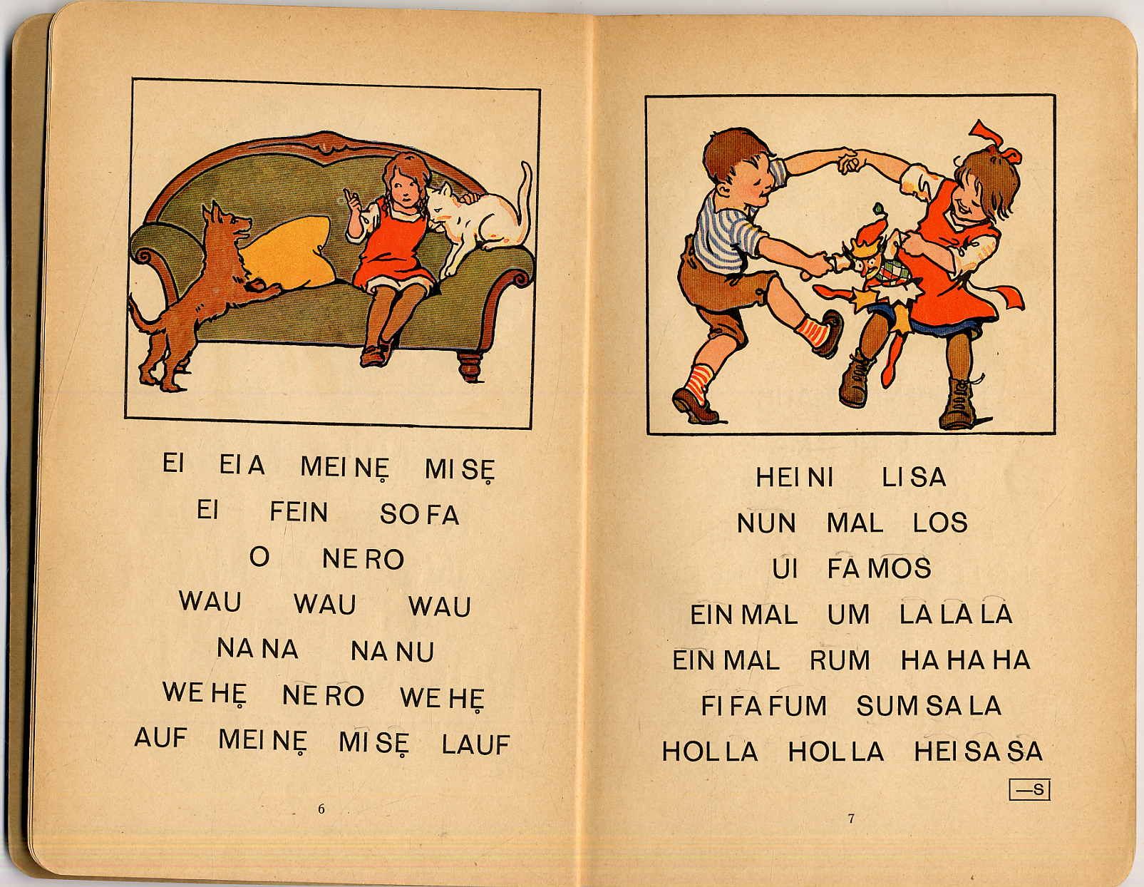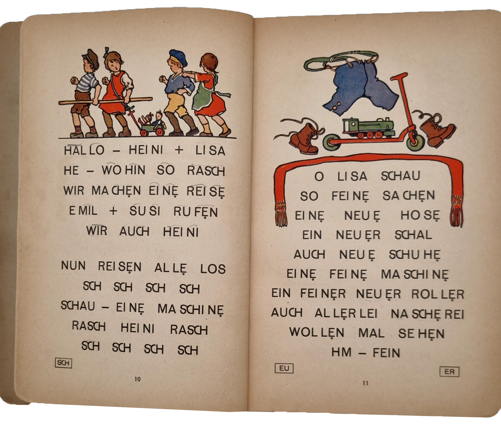 Haijer, Jan; Fritz Köhlhoff und Otto Zimmermann: Froh und Frei. Erstes Lesebuch für die Kinder des westfälischen Industriegebiets. Im Auftrage des Westfälischen Lehrervereins verfaßt. Vielfach geänderte Ausgabe für evangelische Schulen. Dortmund, W. Crümell, ca. 1930. Ca. 23 x 16 cm. 100 Seiten. Mit zahlreichen farbigen Bildern von Ernst Kutzer. Farbig illustrierter Orig.-Karton.