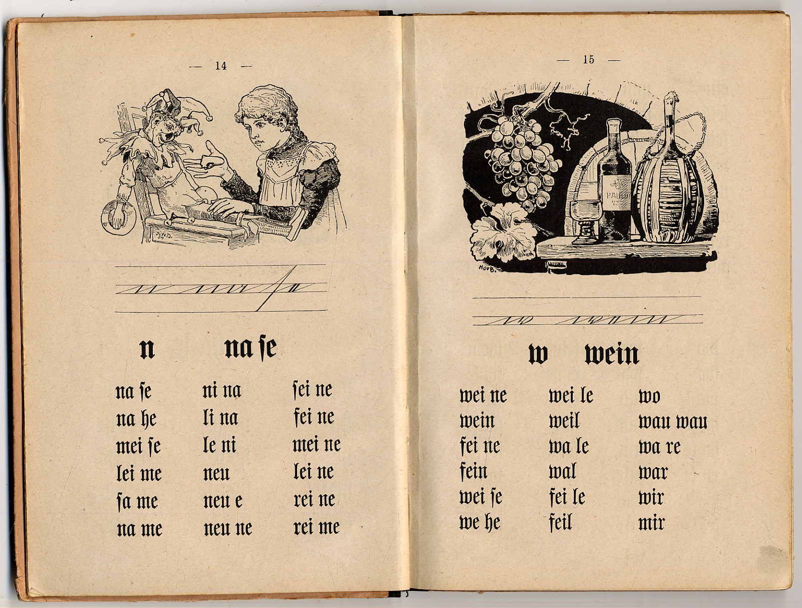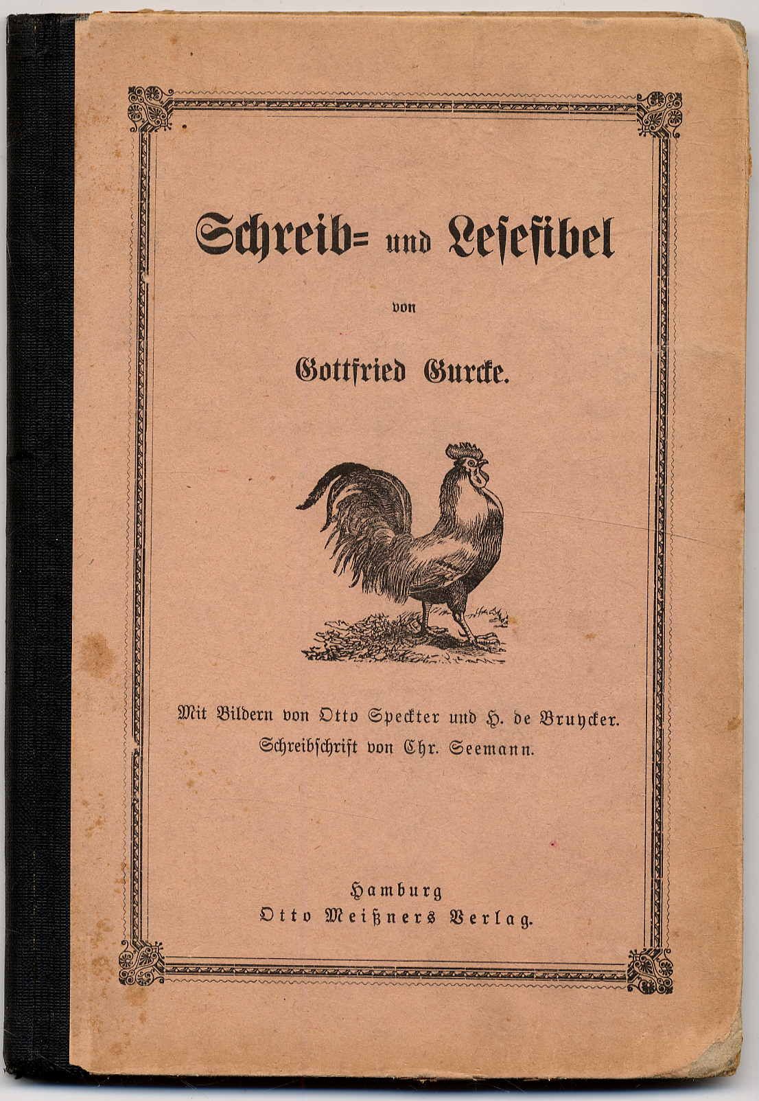Gurcke, Gottfried: Schreib- und Lesefibel. 241. Auflage. Hamburg, Otto Meißner, 1917. Ca. 20 x 14,5 cm. 128 Seiten. Mit zahlreiche Bildern von Otto Speckter und H. de Bruycker. Schreibschrift von Chr. Seemann. Illustr. Original-Halbleinenband. Teistler 1805.77; May/Schweitzer 66 (219. Aufl.): „Gottfried Gurcke hat seine Fibel immer wieder neu auflegen lassen und verändert. … Die Leselernmethode bleibt dieselbe, nur die Lesestücke passen sich dem Wechsel der Zeiten an.“ Text in Fraktur und Kurrentschrift. Einbandkanten etwas bestoßen. Seitenränder und Schnitt etwas fleckig.
