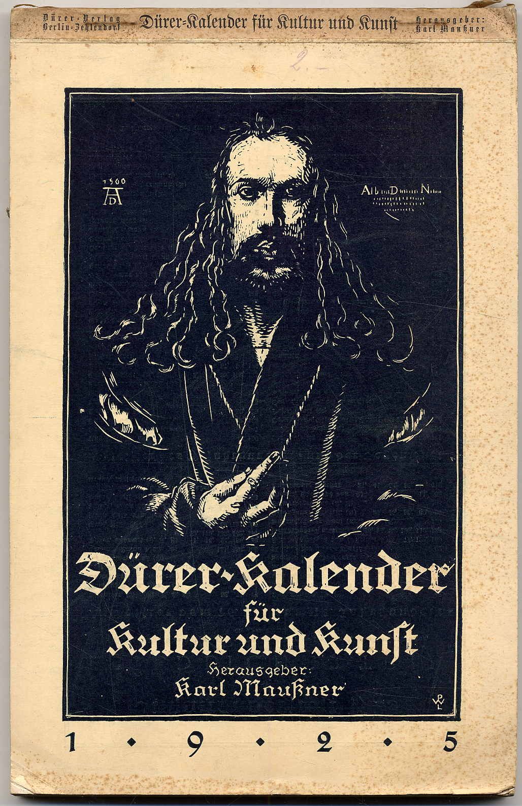 Maußner, Karl (Hrsg.): Dürer-Kalender für Kultur und Kunst. Berlin-Zehlendorf, Dürer Verlag, 1924. Ca. 26 x 17 cm. 160 Seiten, jedes Blatt mit einer Illustration. Abreißkalender. Gedichte, Bilder (″Meister“ vom 15. Jahrhundert bis zur Gegenwart) und Texte deutscher Schriftsteller und Künstler. Deckblatt und Schnitt etwas fleckig. Mit Aufstellvorrichtung auf der Rückseite.