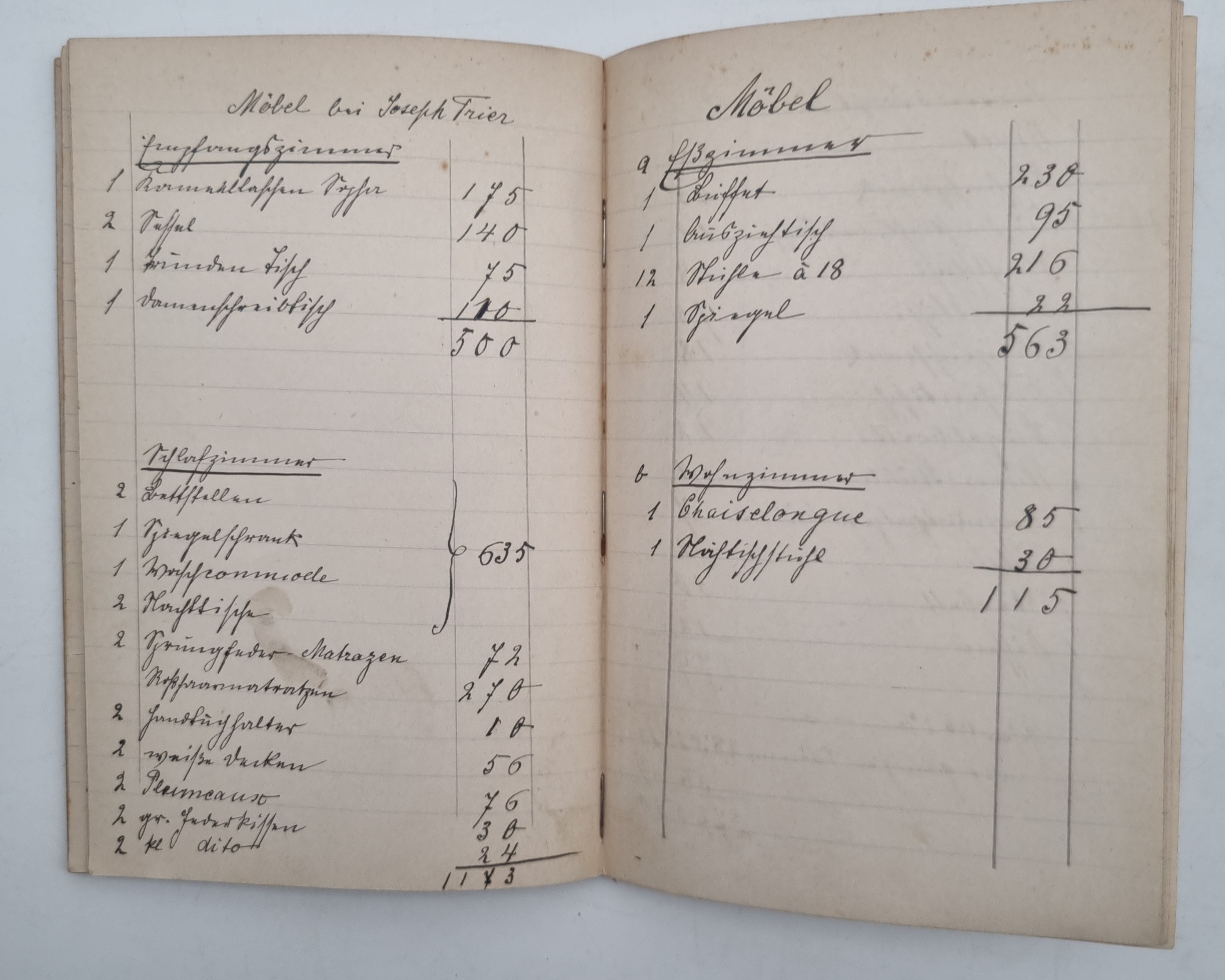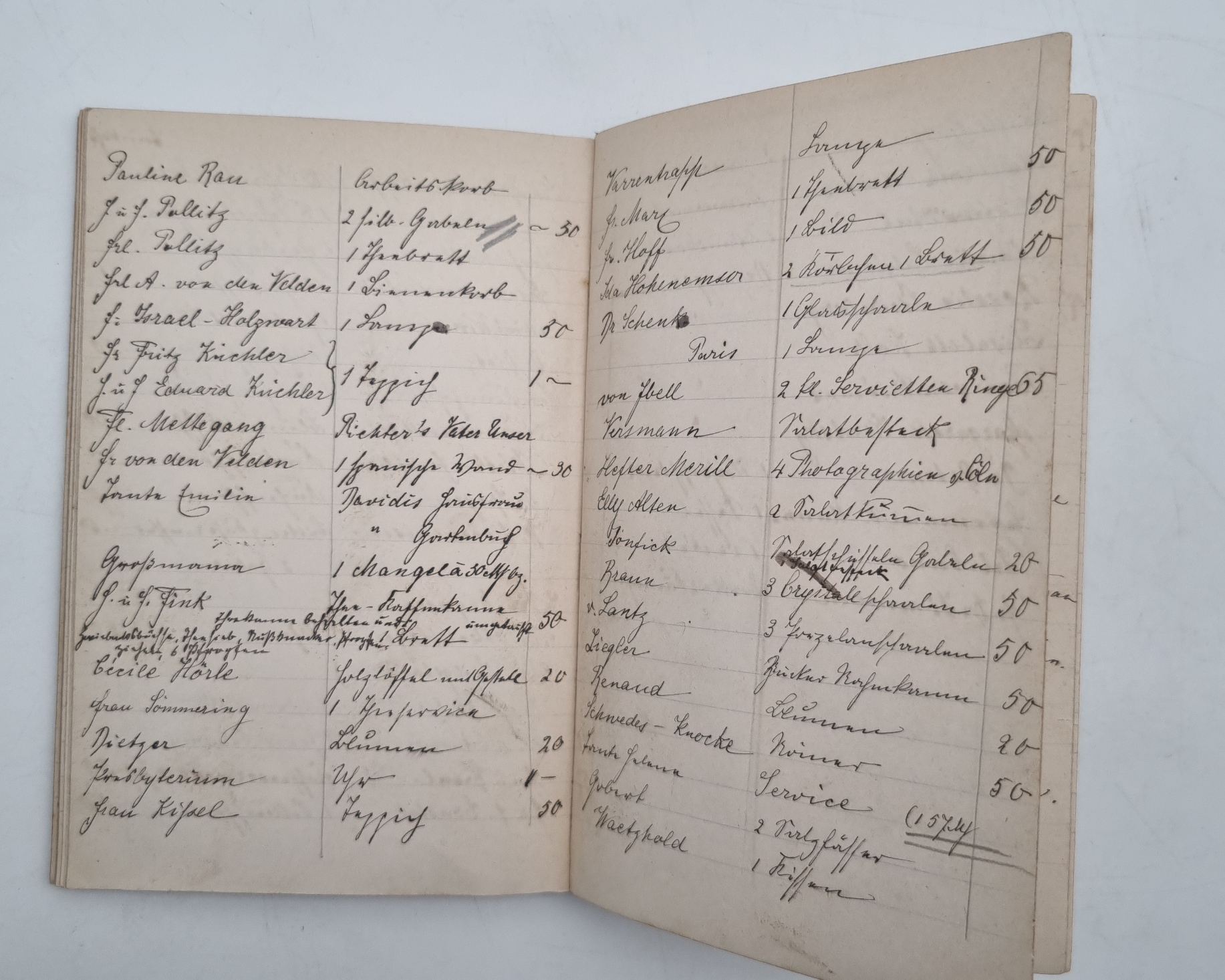 Ehlers, Anna (verh. Börsch): Ausstattung 1891. Deutsche Handschrift auf Papier. Ohne Ort [Hamburg], 1891. Ca. 15,5 x 10,5 cm. 29 beschriftete Seiten und einige leere. Halbleinenband der Zeit. Verzeichnis der Aussteuergegenstände und der Hochzeitsgeschenke. Anna Ehlers (1863-1932) heiratete 1891 den Pfarrer in Eschersheim Eugen Börsch (1859-1934). Anna Börsch korrespondierte wie ihr Sohn Rudolf mit Else Lasker-Schüler, ihre Tochter Lili wurde Kinderbuchautorin. Verzeichnet Wäsche aller Art, Kücheneinrichtung, Möbel, Wochenbett- und Kinder-Ausstattung. Interessant ist auch das Verzeichnis der Hochzeitsgeschenke. Kulturhistorisch interessant.