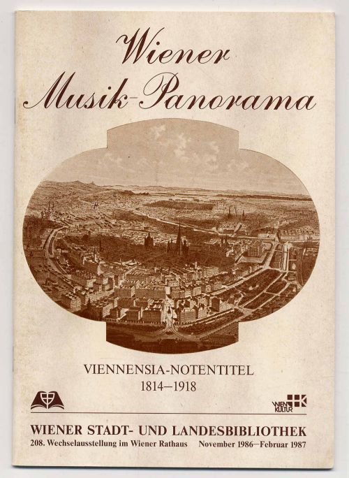Patzer, Franz (Hrsg.): Wiener Musik-Panorama Viennensia-Notentitel (1814-1918). Wien, 1986. Ca. 21 x 15 cm. 48 Seiten. Mit Abbildungen. Illustrierte Originalbroschur. 208. Wechselausstellung der Wiener Stadt- und Landesbibliothek. „Die nach dem Erscheinungsjahr gereihten Notenausgaben aus den reichhaltigen Beständen der Wiener Stadt- und Landesbibliothek veranschauchlichen somit den kulturgeschichtlich bedeutsamen Zeitraum vom Vormärz bis zum „Fin de siècle“ und zeigen darüber hinaus die Entwicklung der Gebrauchsgraphik in jener Epoche auf.“ (Vorwort).